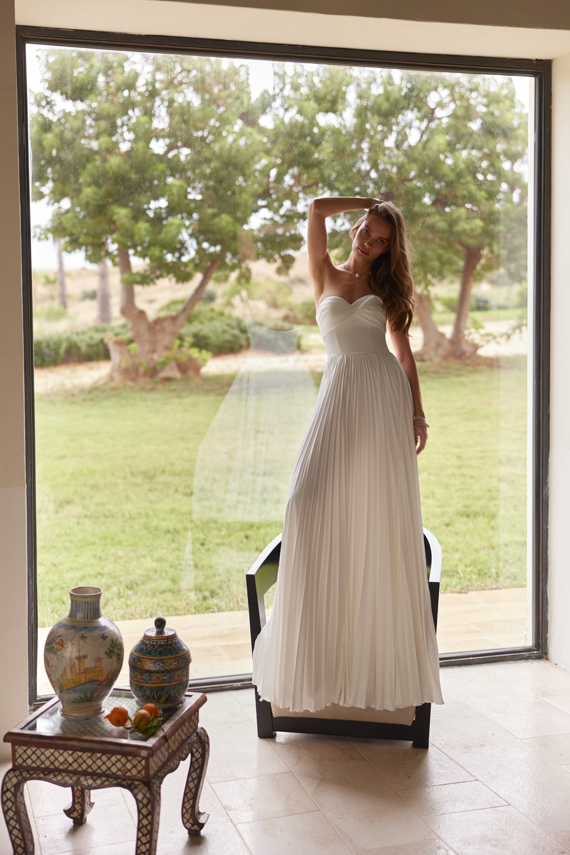 Das Brautkleid L602 ist verspielt, modern und voller müheloser Bewegung. Gefertigt aus leichtem Crash-Taft überzeugt es mit einer besonderen Textur, die zugleich raffiniert und entspannt wirkt. Die A-Linien-Silhouette fließt sanft vom figurbetonten Mieder herab und formt eine luftige, weiche Linie, die bei jedem Schritt lebendig wirkt. Ein zart gefalteter herzförmiger Ausschnitt verleiht romantische Leichtigkeit, während der ärmellose Schnitt den Look klar und frisch hält.