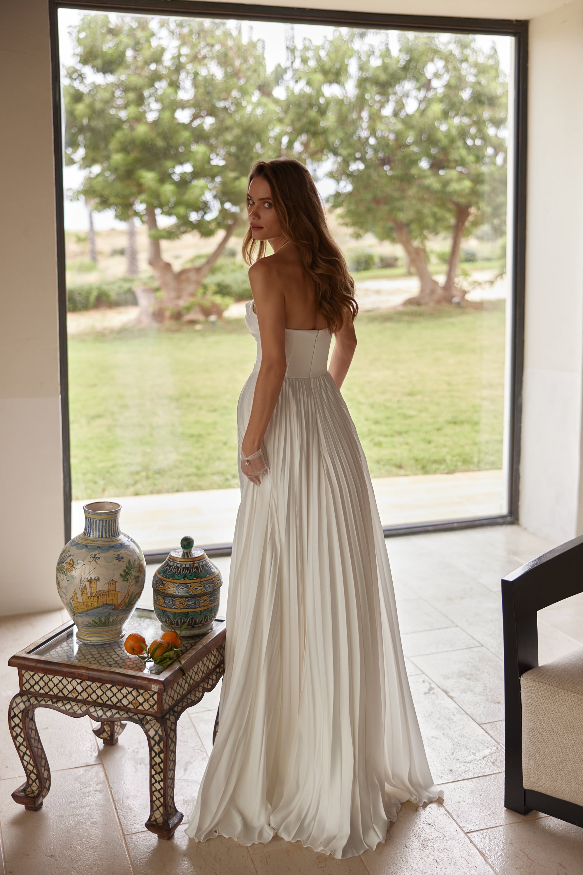 Am Rücken sorgt eine feine Schnürung für klassischen Charme und führt in einen schwungvollen, bodenlangen Rock. Dieses Brautkleid wirkt unbeschwert und dennoch tief elegant — ideal für Bräute, die Schönheit mit einem Gefühl von Freiheit verbinden möchten.
