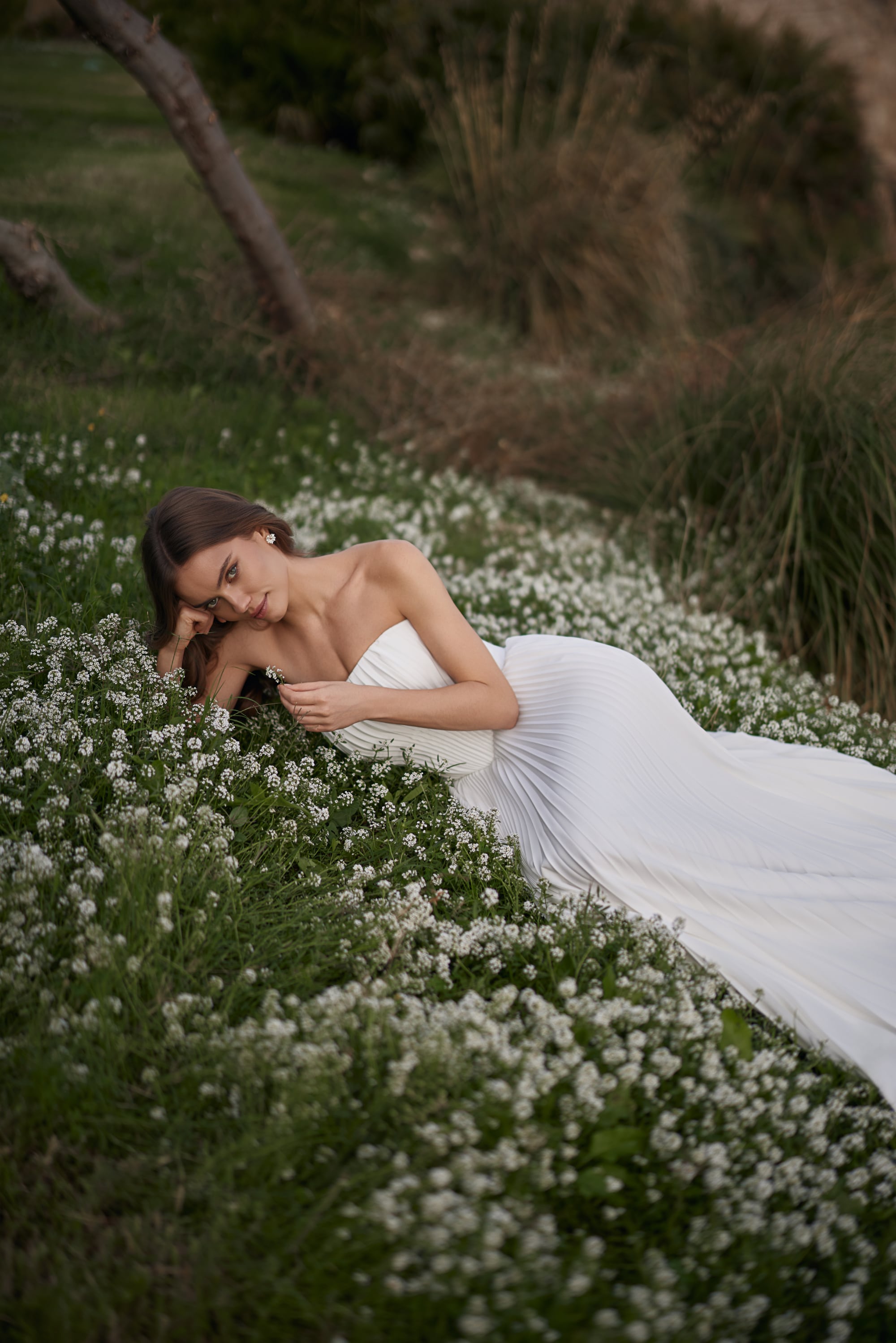 Der klare Straight-Across-Ausschnitt verleiht dem Oberteil moderne Schlichtheit, während die feinen Plissees sanfte Struktur und Eleganz hinzufügen. Der ärmellose Schnitt sorgt für Leichtigkeit und Luftigkeit — ideal für eine Outdoor- oder Destination-Hochzeit. Ein glatter Reißverschluss am Rücken vollendet das Design, während der bodenlange Rock ruhig und anmutig fällt. Dieses Kleid steht für zurückhaltende Schönheit in ihrer reinsten Form — poetisch, klar und zeitlos.