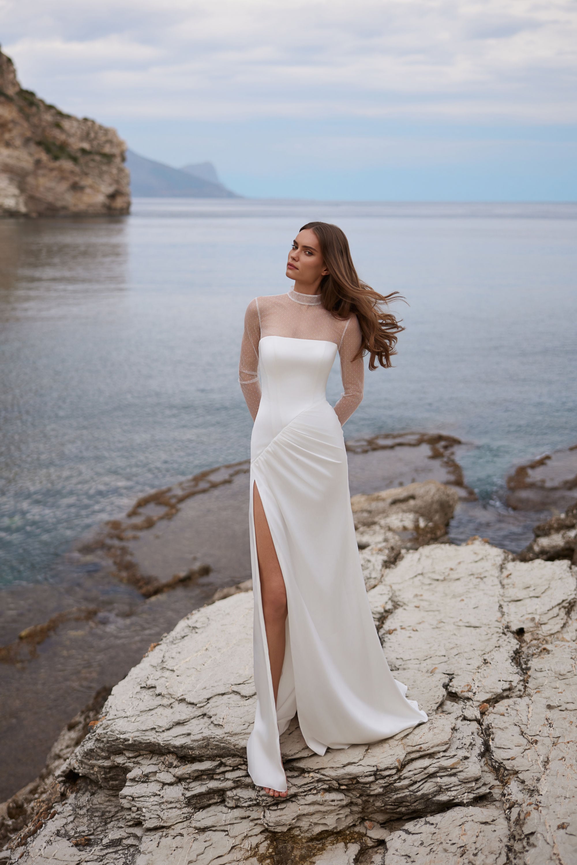 Das Brautkleid L607 ist weich, mühelos und von stiller Anziehungskraft. Gefertigt aus plissiertem Krepp-Satin begeistert es mit einer feinen Textur, die das Licht bei jeder Bewegung einfängt. Die Sheath-Silhouette legt sich natürlich an den Körper und schafft eine lange, fließende Linie, die zugleich entspannt und elegant wirkt.