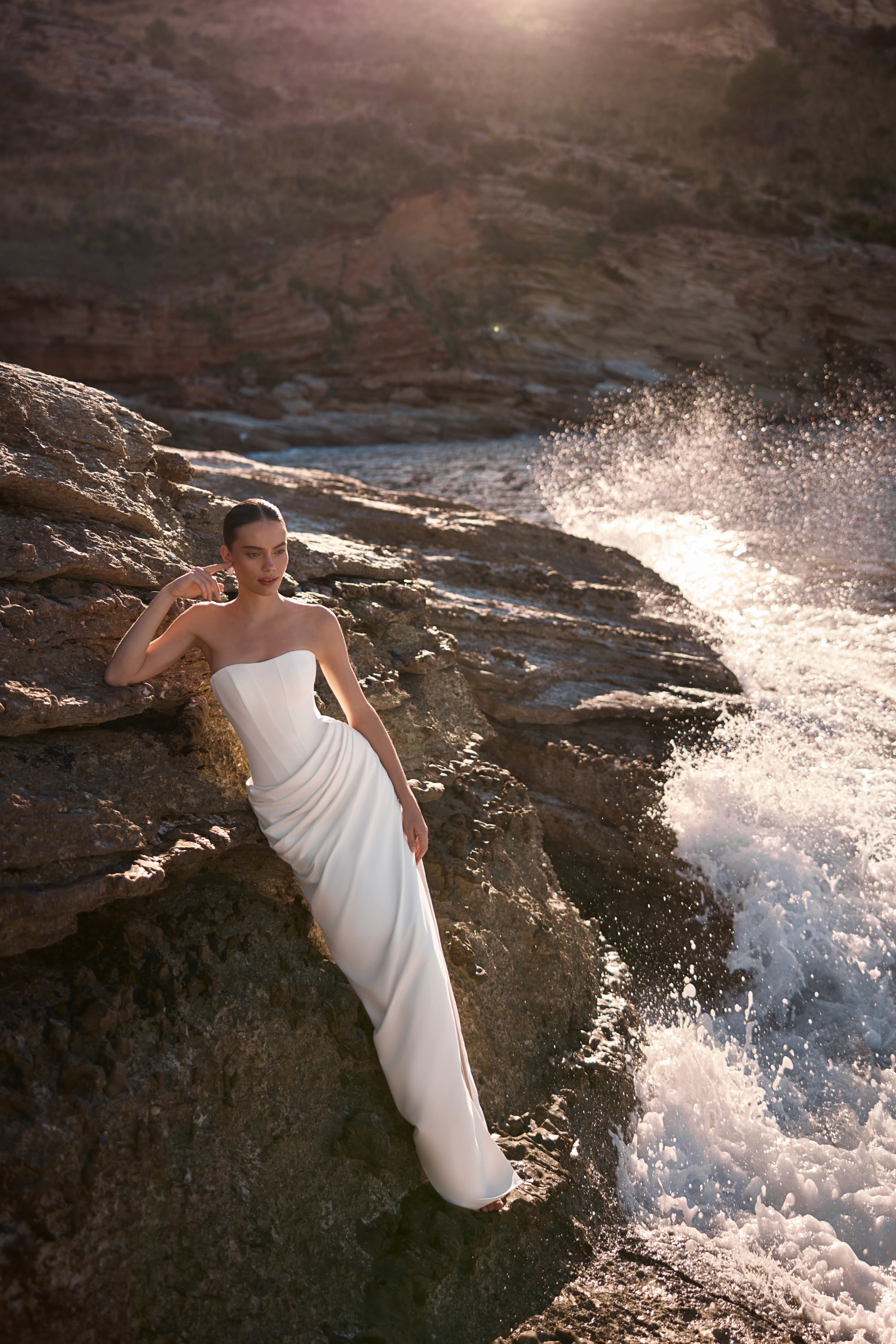 La robe de mariée L623 est un modèle minimaliste à la beauté calme et sculpturale. Confectionnée en satin mat, elle épouse une silhouette droite de type Sheath, élégante sans effort. Le décolleté semi-cœur dessine une ligne féminine et douce, tandis que le corsage structuré affine subtilement la silhouette. Des plis drapés au niveau de la hanche apportent du mouvement et une touche artistique inattendue, équilibrant la pureté du design. Une jupe longueur sol et une fermeture éclair discrète au dos complètent l’ensemble. L623 est idéale pour les mariées qui recherchent simplicité, assurance et une esthétique moderne d’inspiration côtière — naturelle, raffinée et délicatement discrète.