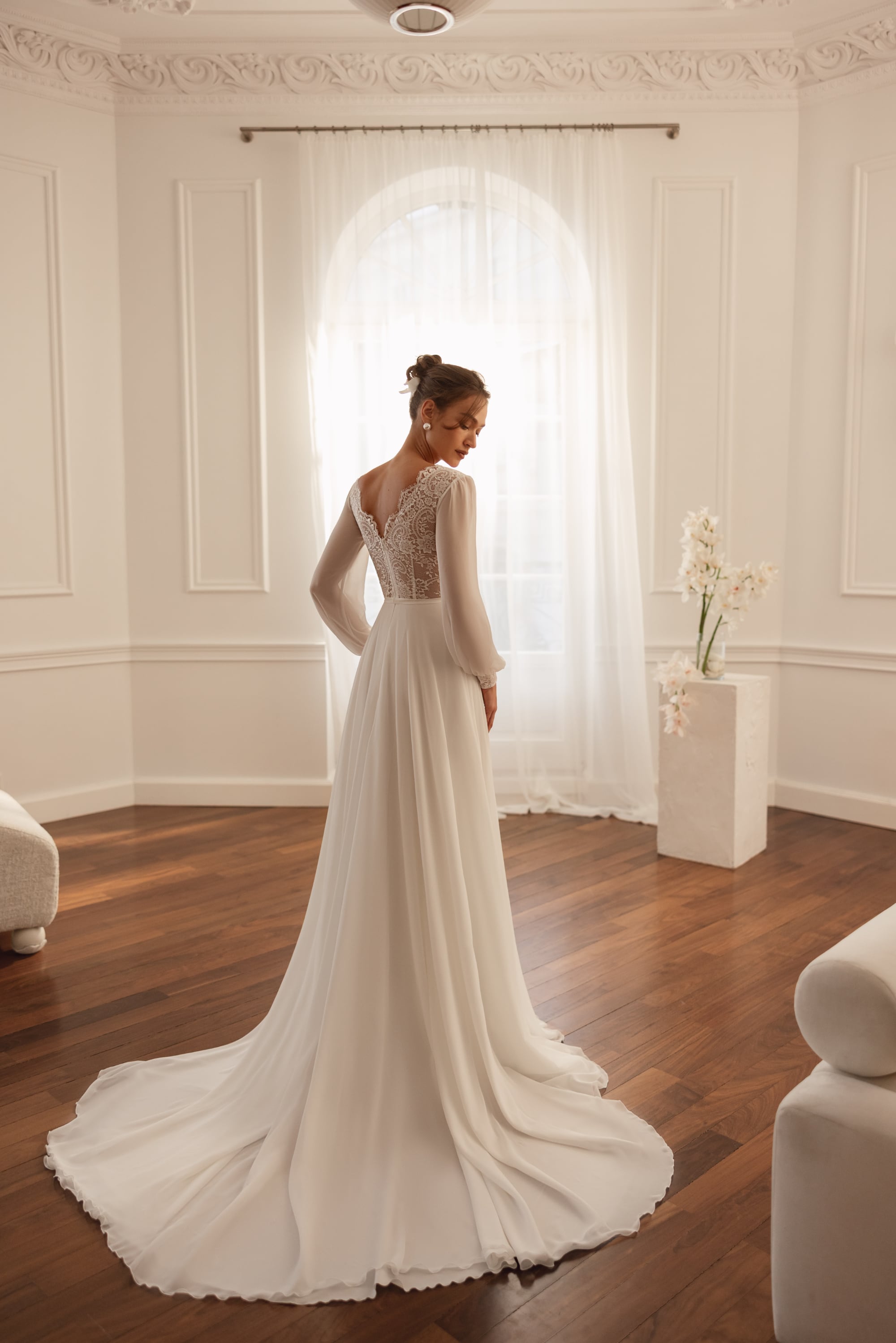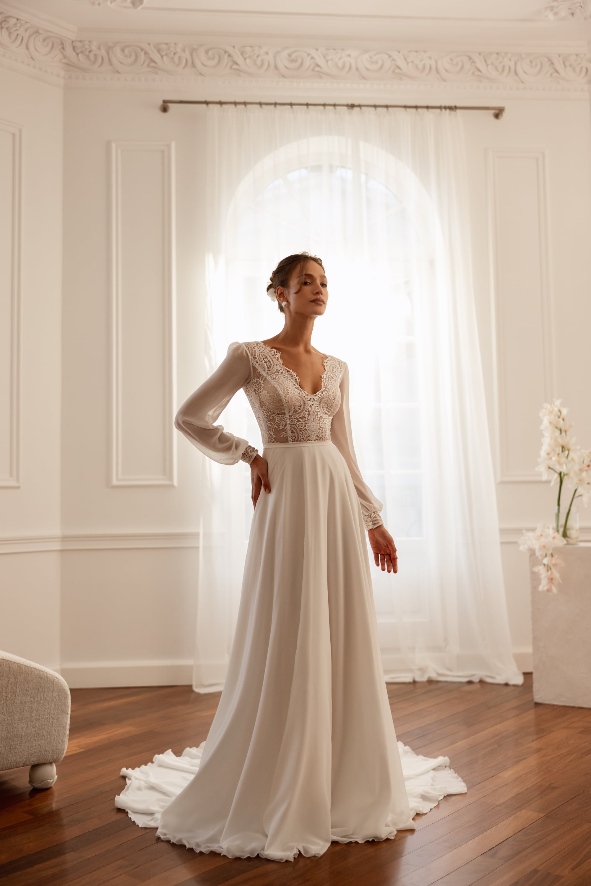 Sensuale ma sofisticato, questo abito è pensato per la sposa che sceglie delicatezza e carattere in perfetto equilibrio.