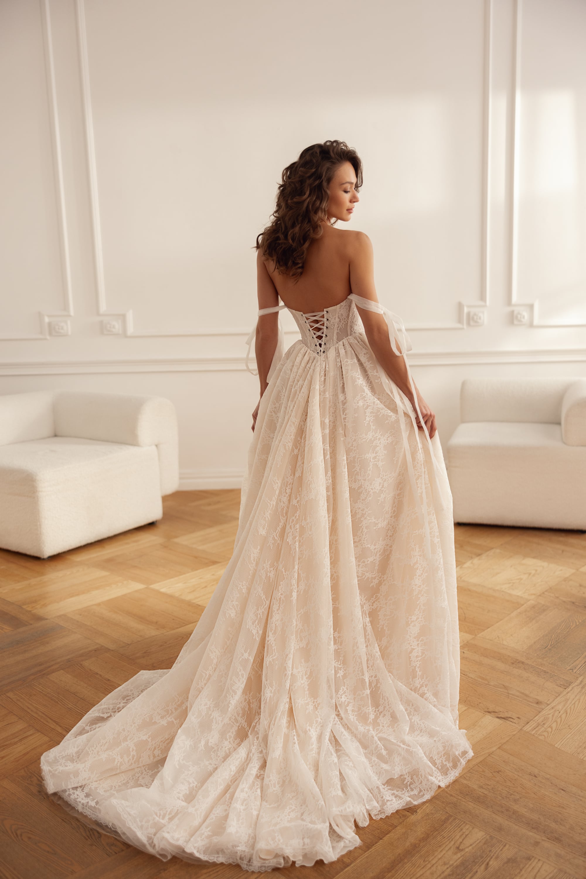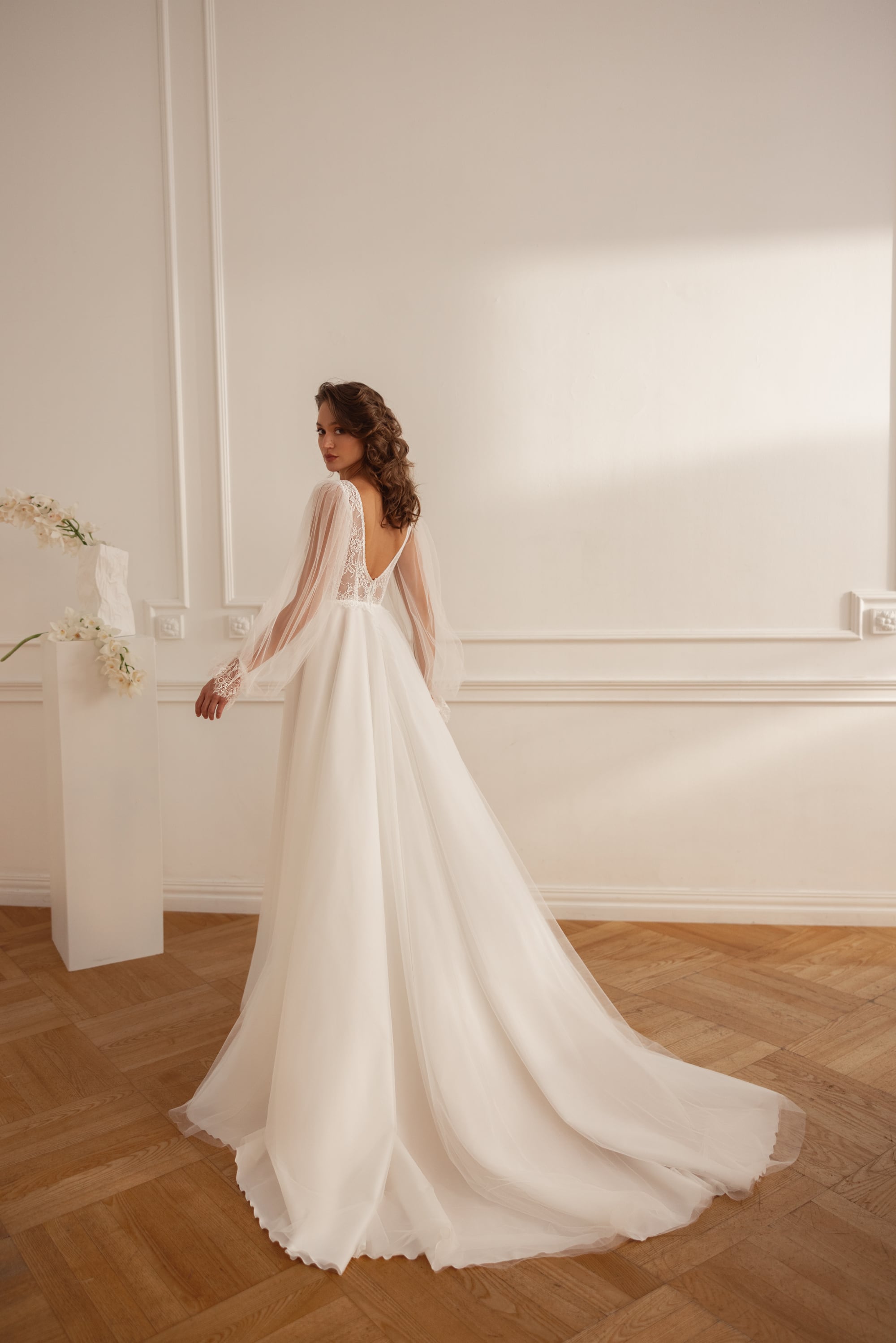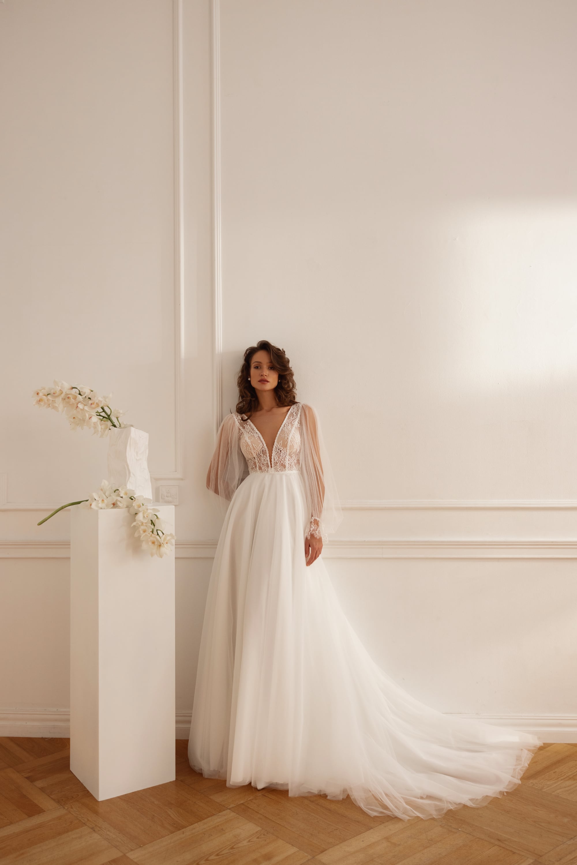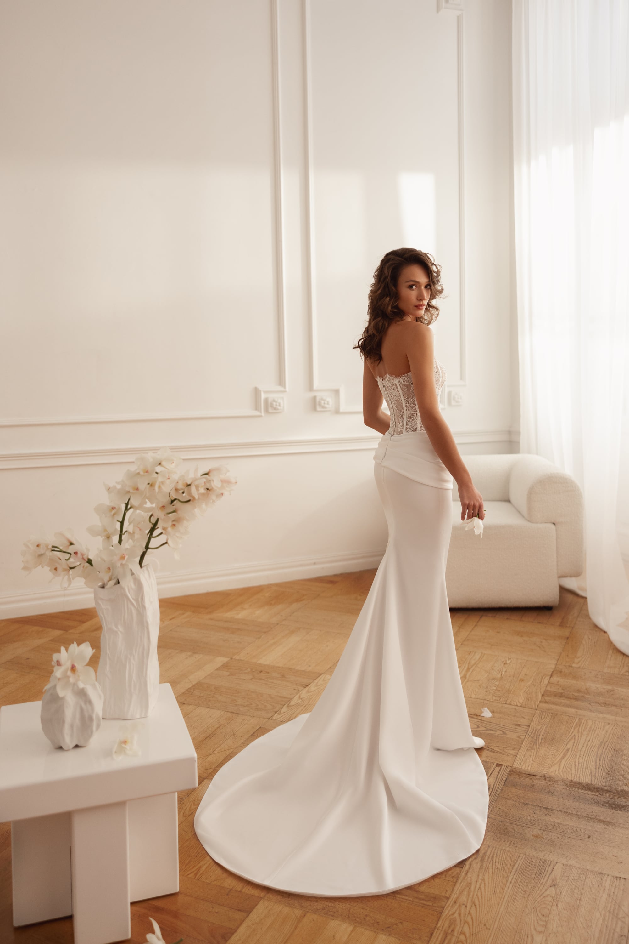 La scollatura a V dona morbidezza al corpetto strutturato, mentre le maniche lunghe e dritte aggiungono equilibrio e raffinatezza couture. Una fila di bottoni sul retro e una gonna fluida lunghezza a terra completano l’insieme — lusso bridal moderno, sicuro, sensuale e curato in ogni dettaglio.