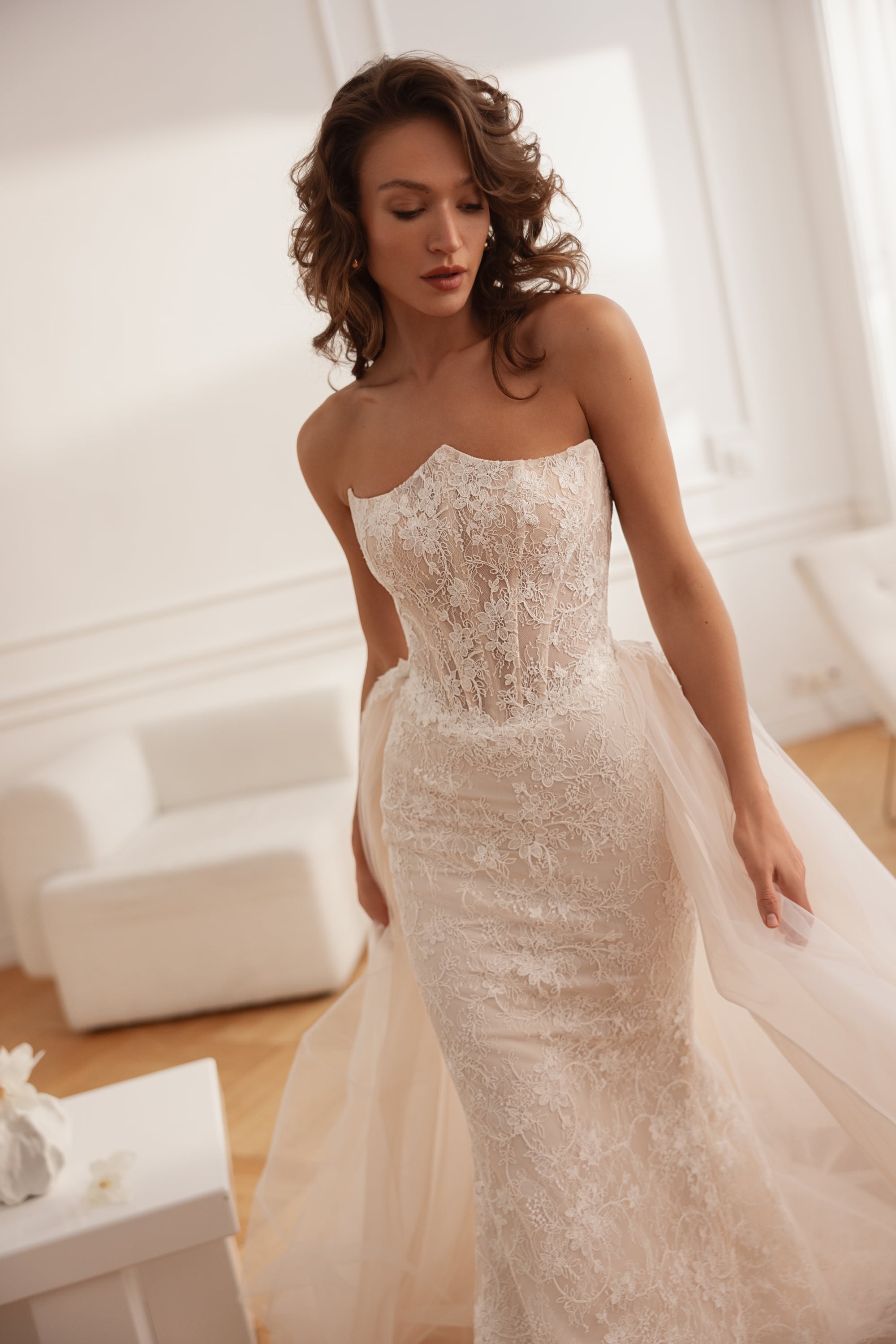 Realizzato in pizzo corded lace dalla trama ricercata, scolpisce delicatamente la silhouette, valorizzando ogni curva con sobria sofisticazione. Il taglio fit & flare slancia la figura e scende in un morbido strascico elegante.