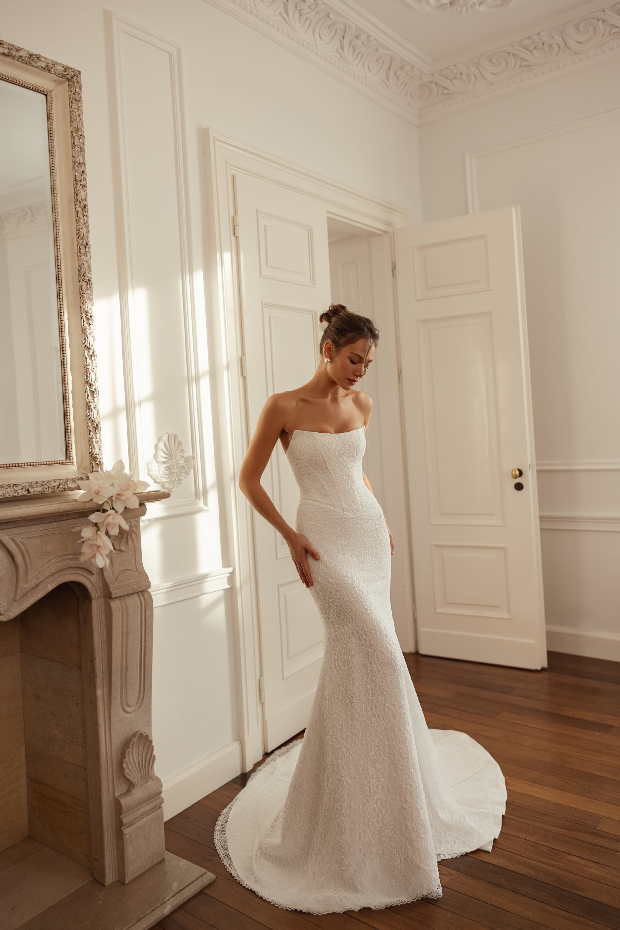Realizzato in raffinato pizzo cordonato, avvolge la silhouette con una linea Fit & Flare scolpita che si apre in un delicato strascico. La scollatura dritta crea una cornice architettonica pulita, lasciando che la texture del pizzo sia protagonista. Un bolero coordinato in pizzo cordonato può essere aggiunto per una copertura leggera e una finitura sofisticata.
