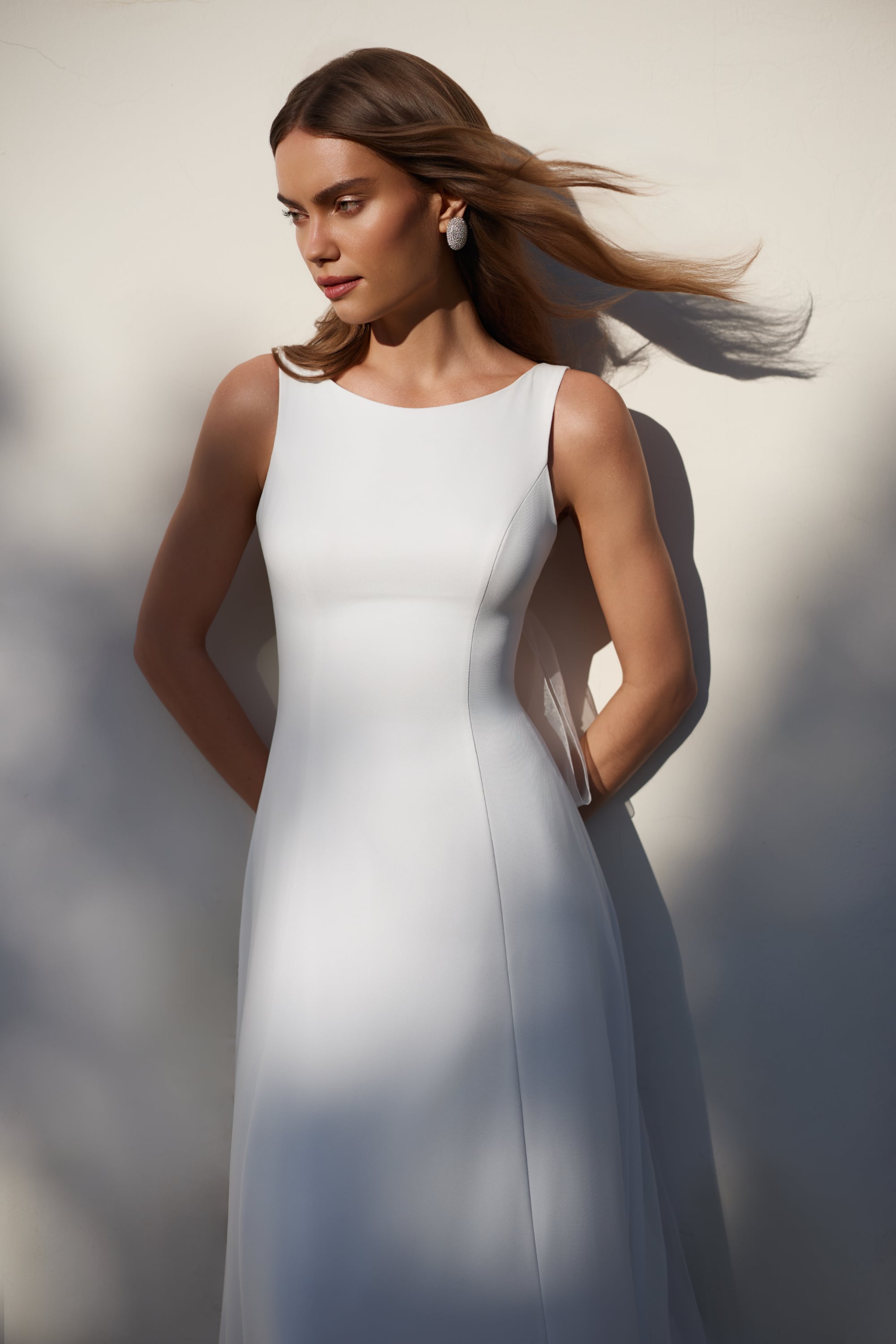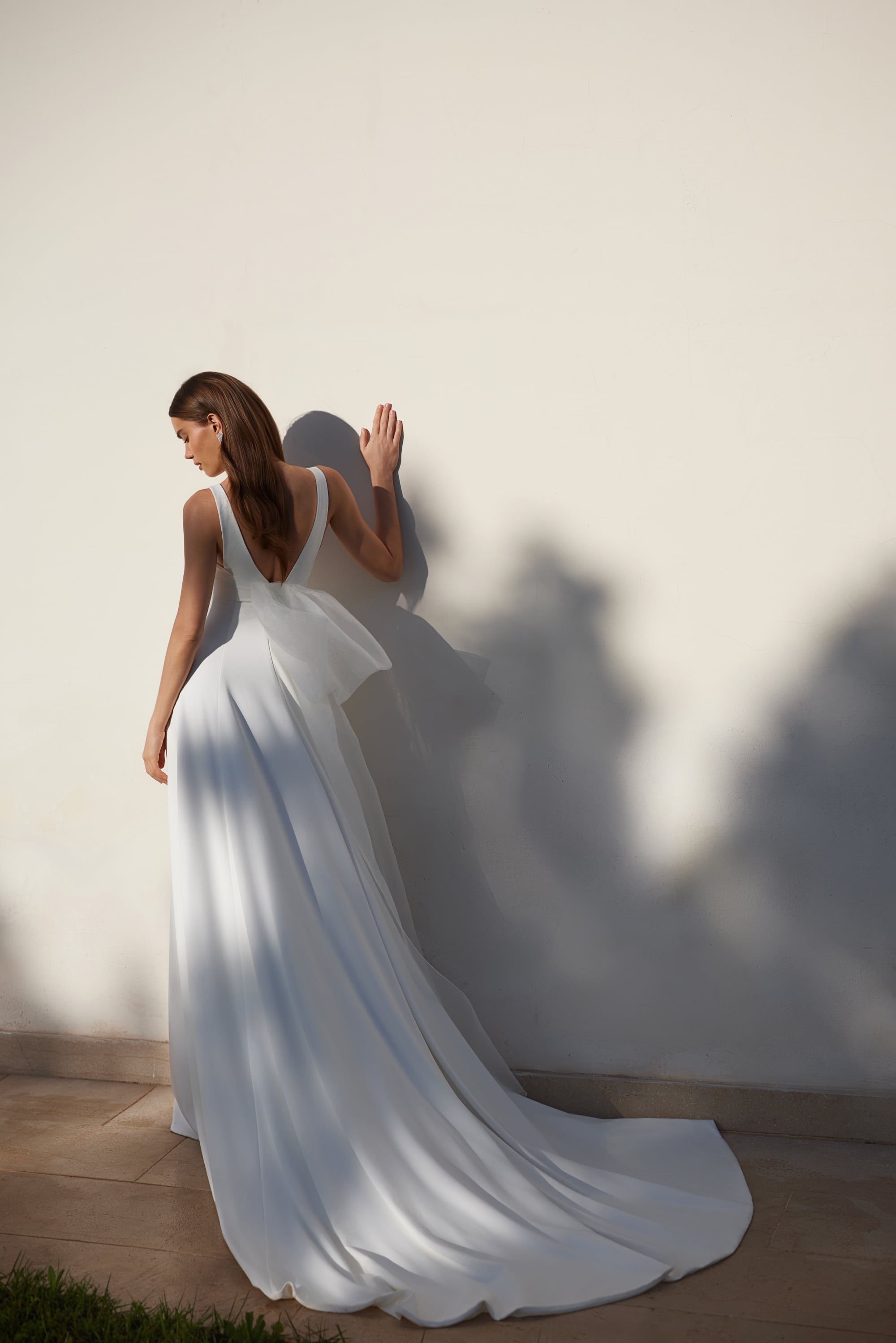 Il dettaglio distintivo è la schiena aperta con profondo scollo a V, che aggiunge sensualità senza compromettere l’equilibrio minimalista. Un delicato elemento architettonico a fiocco sul retro introduce un accento couture, creando volume morbido e un punto focale romantico in movimento.
