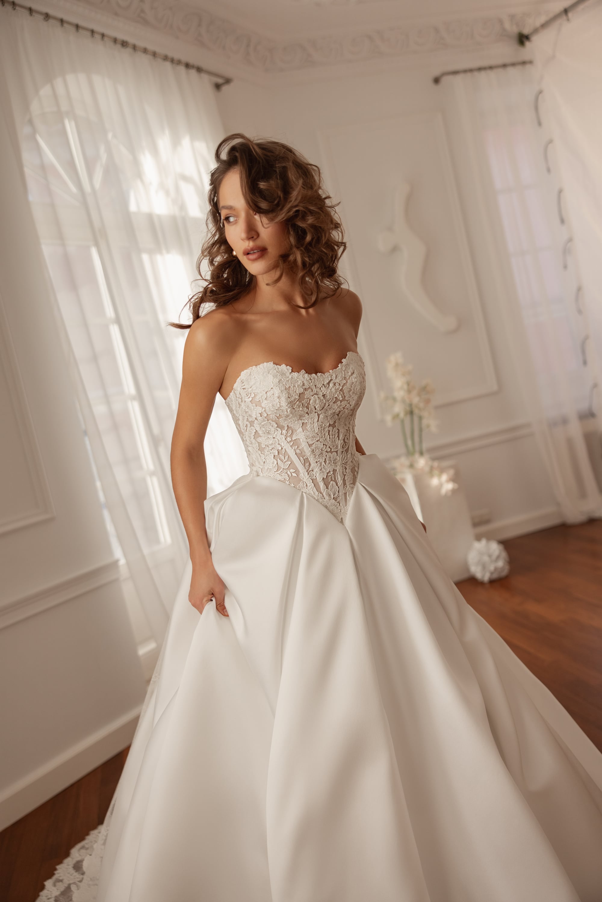 Realizzato in morbido mikado di lusso con delicati dettagli in pizzo cordonato, questa silhouette ball presenta un corpetto scolpito e una gonna ampia dall’eleganza architettonica. La scollatura a cuore addolcisce la linea strutturata, mentre la chiusura con lacci sul retro garantisce una vestibilità perfetta in stile corsetto.