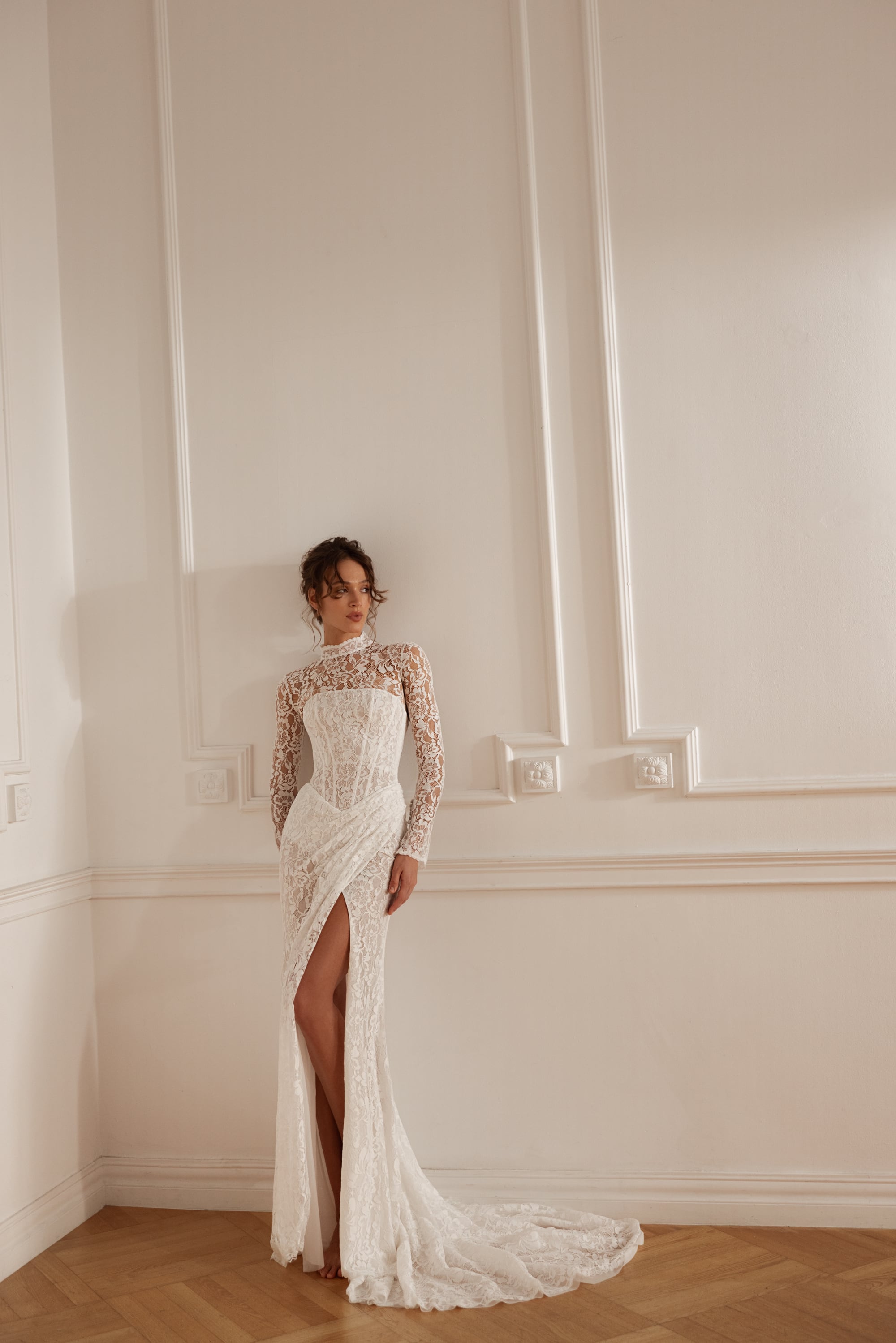 Realizzato in morbido mikado di lusso con delicati accenti in pizzo cordonato, questa silhouette combina un corpetto sagomato con una gonna voluminosa dall’eleganza architettonica. La scollatura a cuore dona dolcezza, mentre la chiusura con lacci sul retro garantisce una vestibilità perfetta in stile corsetto. Un bolero coordinato in pizzo cordonato con collo alto e maniche lunghe può essere aggiunto per un effetto raffinato e stratificato.