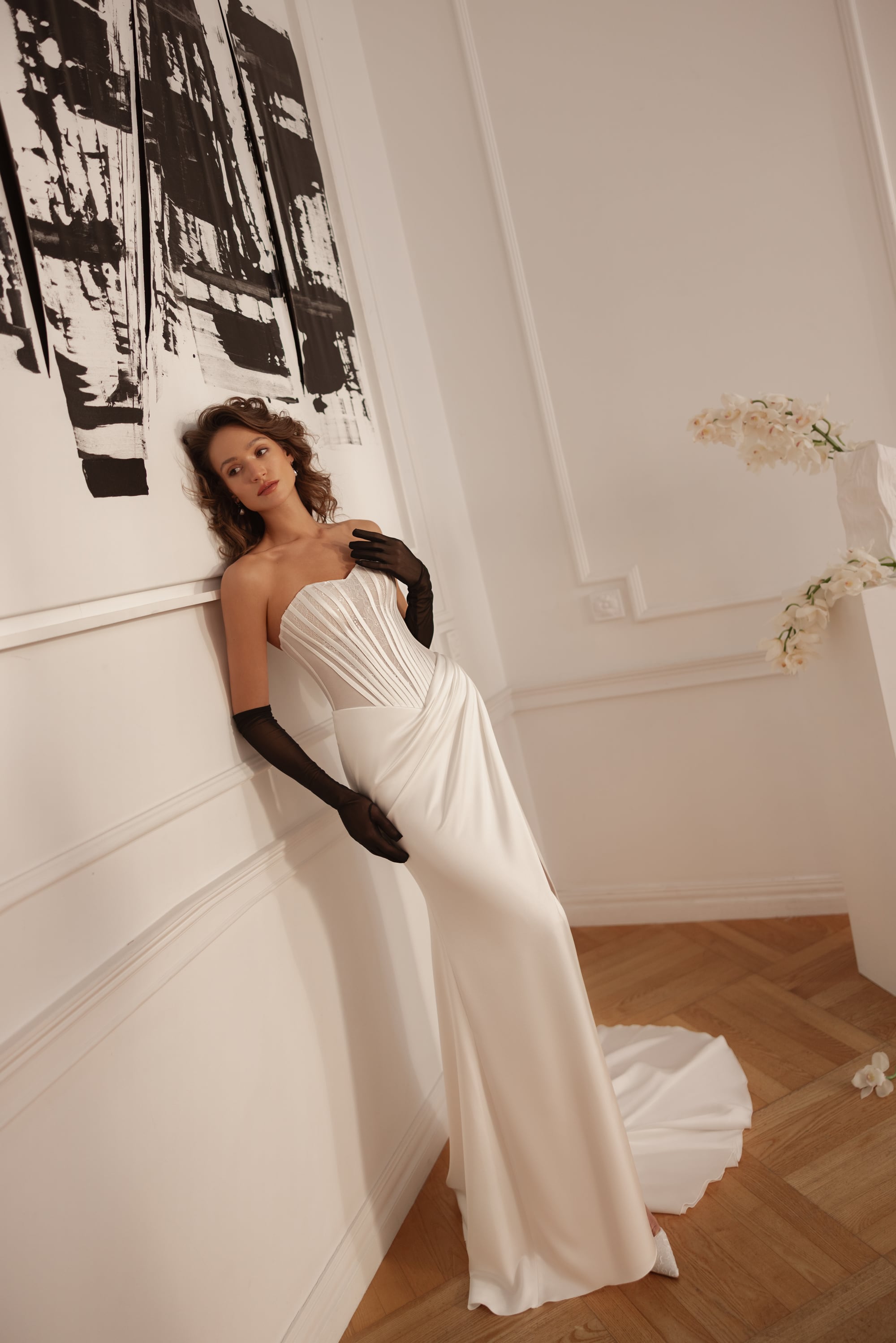 Un corsetto scolpito con scollatura a cuore definisce il punto vita e si apre in una silhouette fit & flare slanciata che allunga la figura. Le linee pulite della gonna contrastano armoniosamente con il corpetto strutturato, mentre il delicato strascico aggiunge un tocco di drammaticità raffinata.
