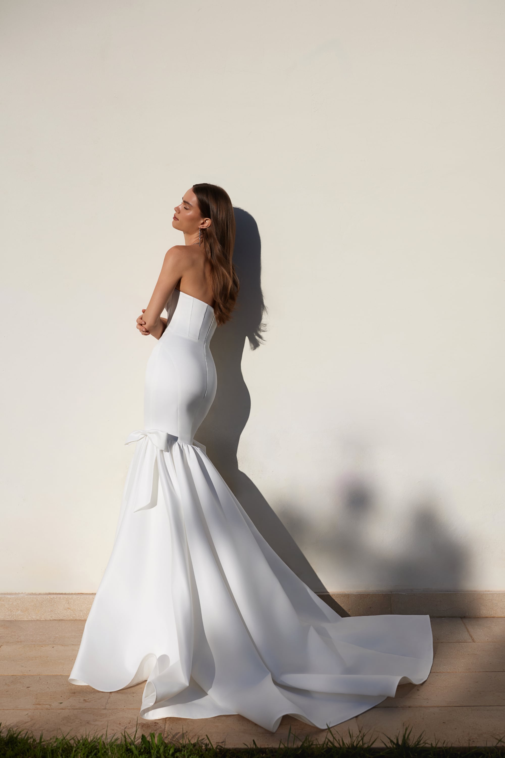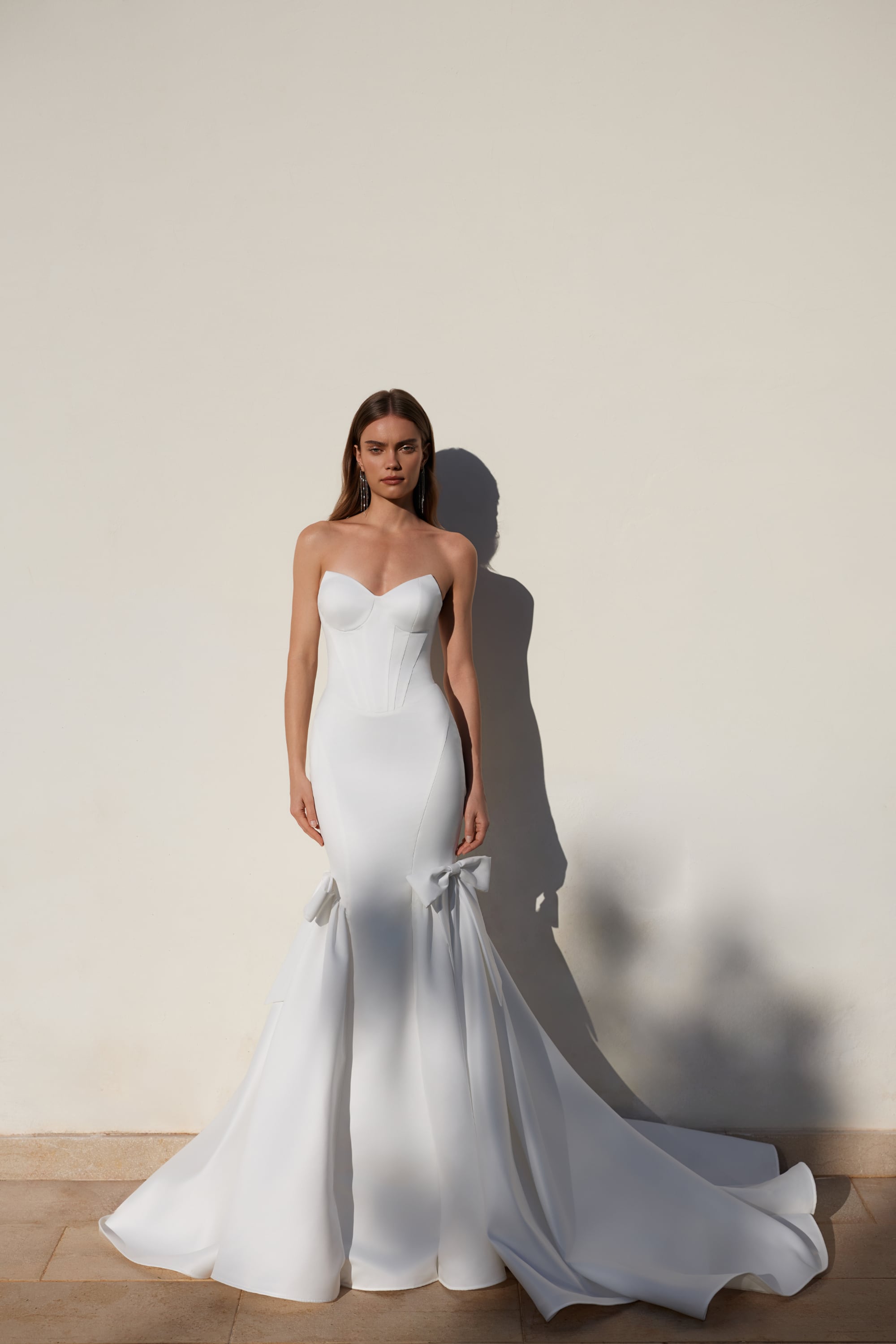 Un abito da sposa in pizzo a linea A, chic e lussuoso, senza tempo e indipendente dalle mode! Il corpetto con allacciatura a cuore si abbina perfettamente alla gonna leggera con strascico sweep.