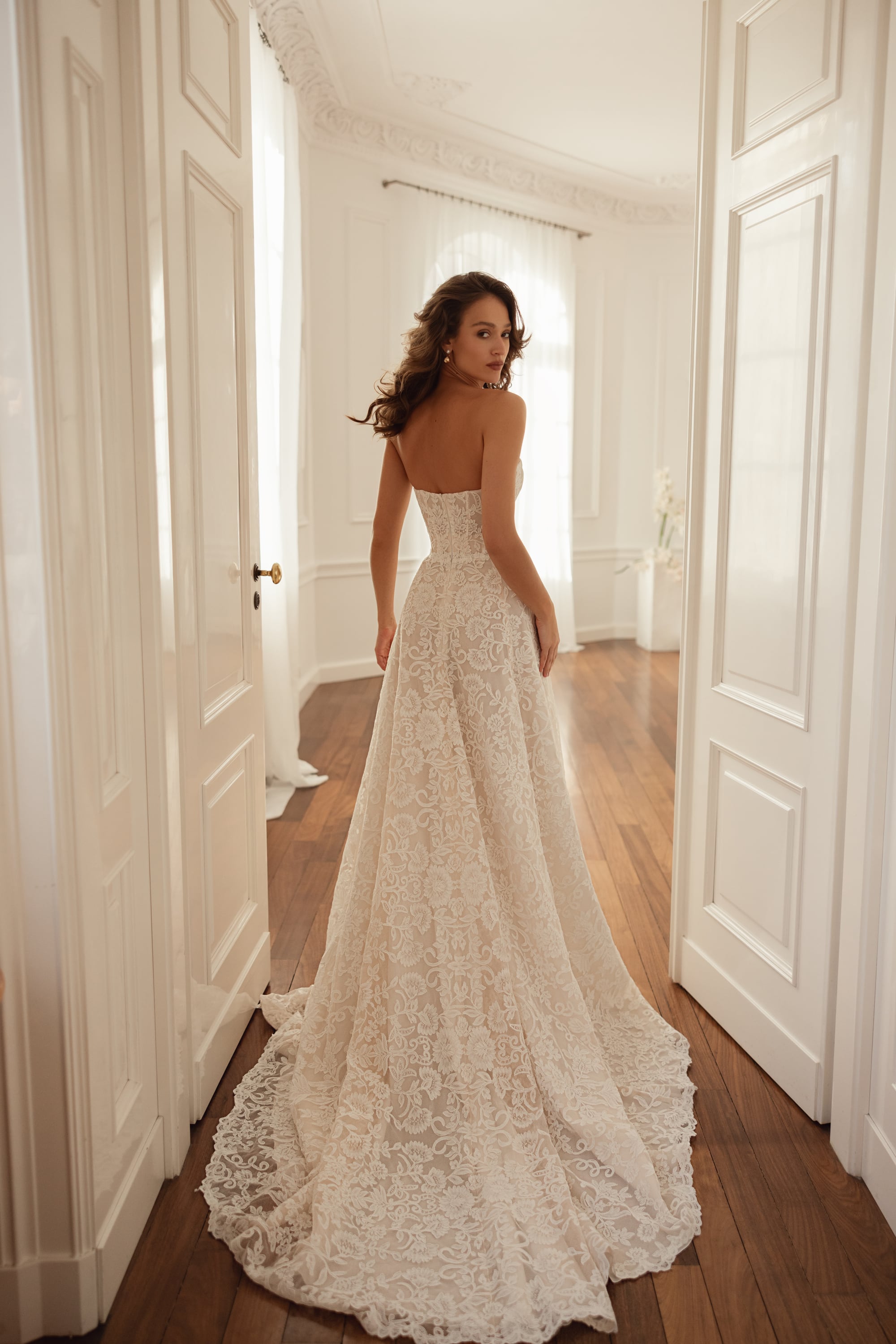 Realizzato interamente in delicato pizzo Chantilly, la silhouette A-line scorre con naturale grazia. La scollatura dritta incornicia dolcemente le spalle, mentre le maniche lunghe in pizzo trasparente aggiungono raffinatezza e profondità. Una fila di bottoni sul retro completa la finitura romantica e conduce a uno strascico leggermente esteso.