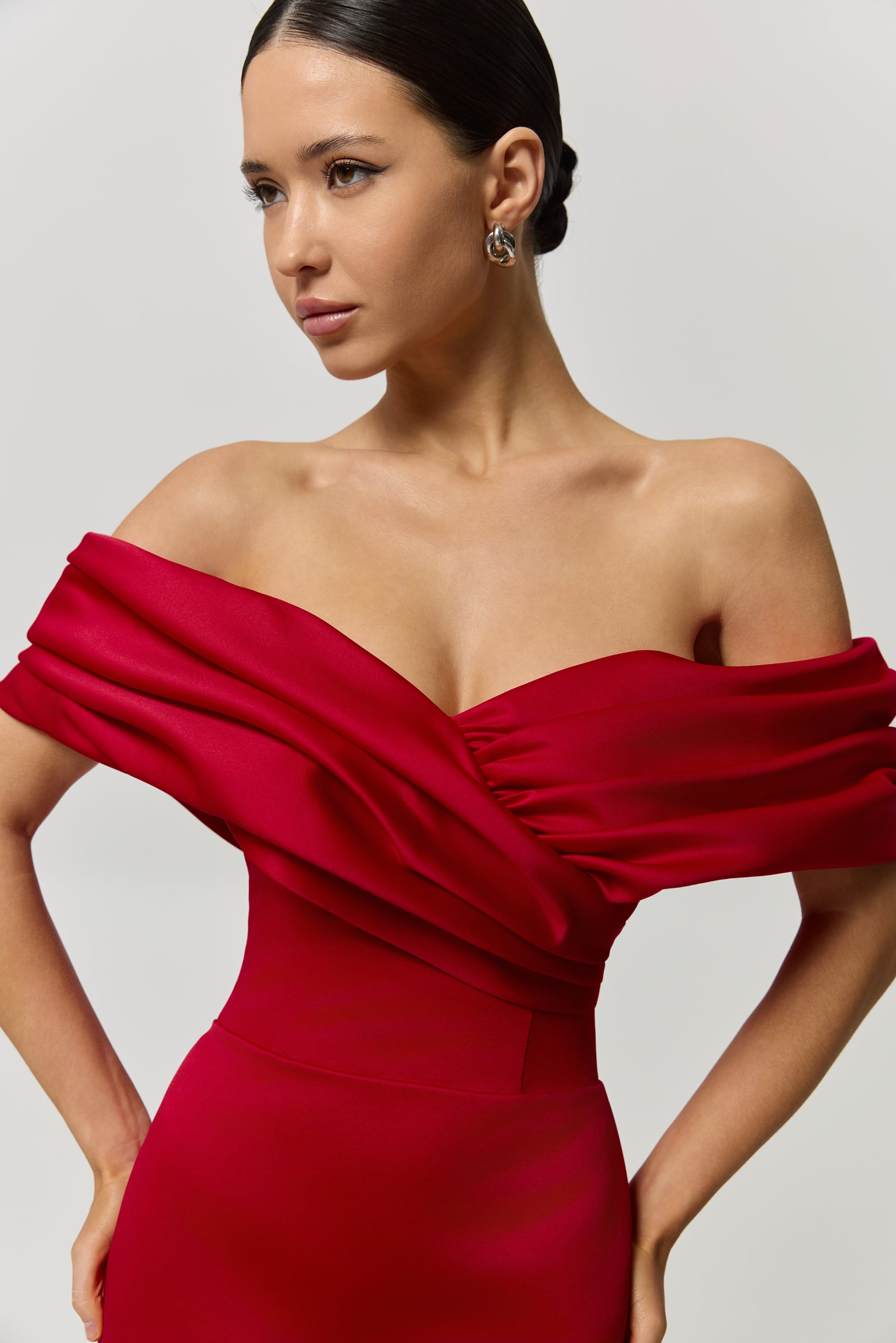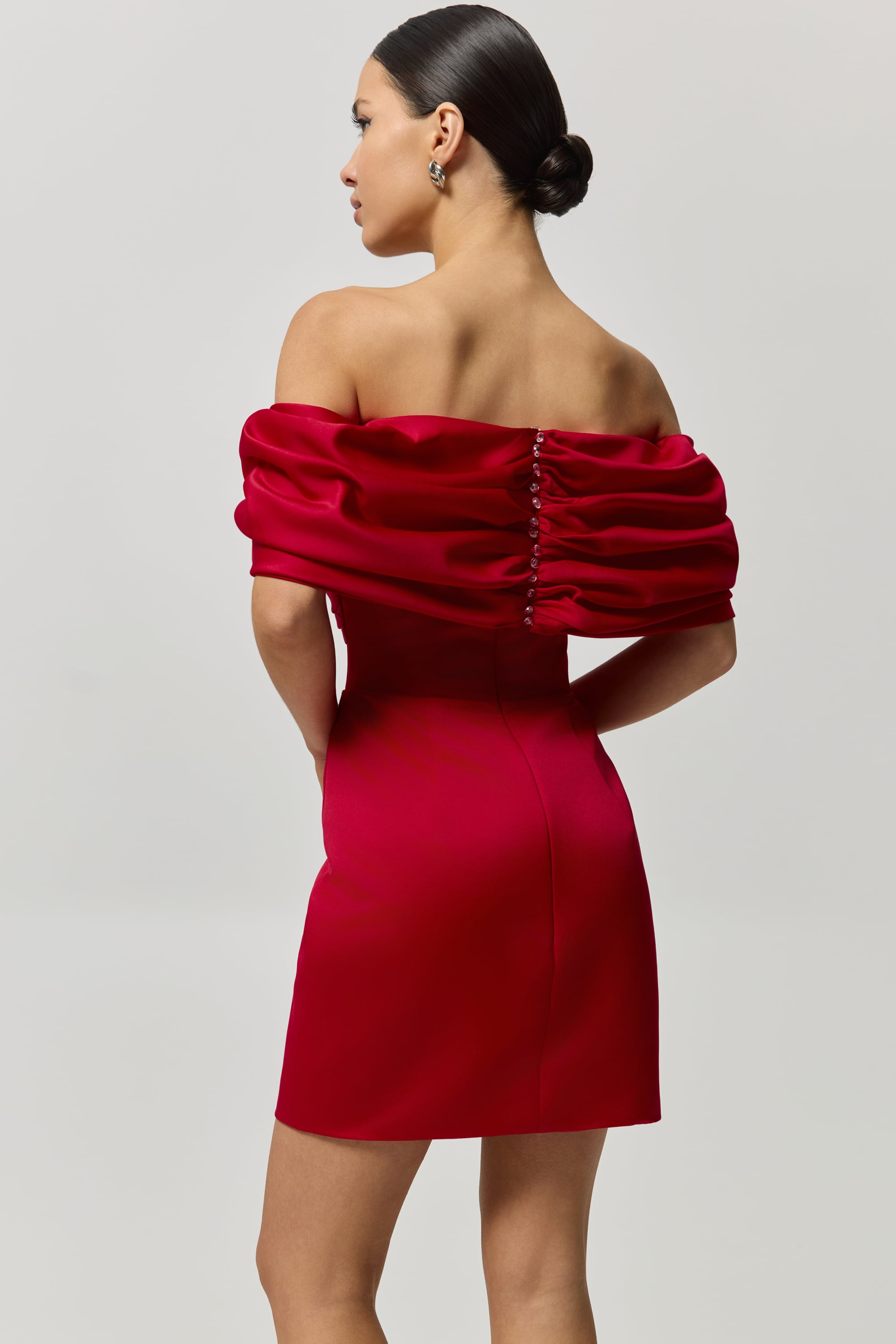 Satynowa wieczorowa sukienka mini z odkrytymi ramionami