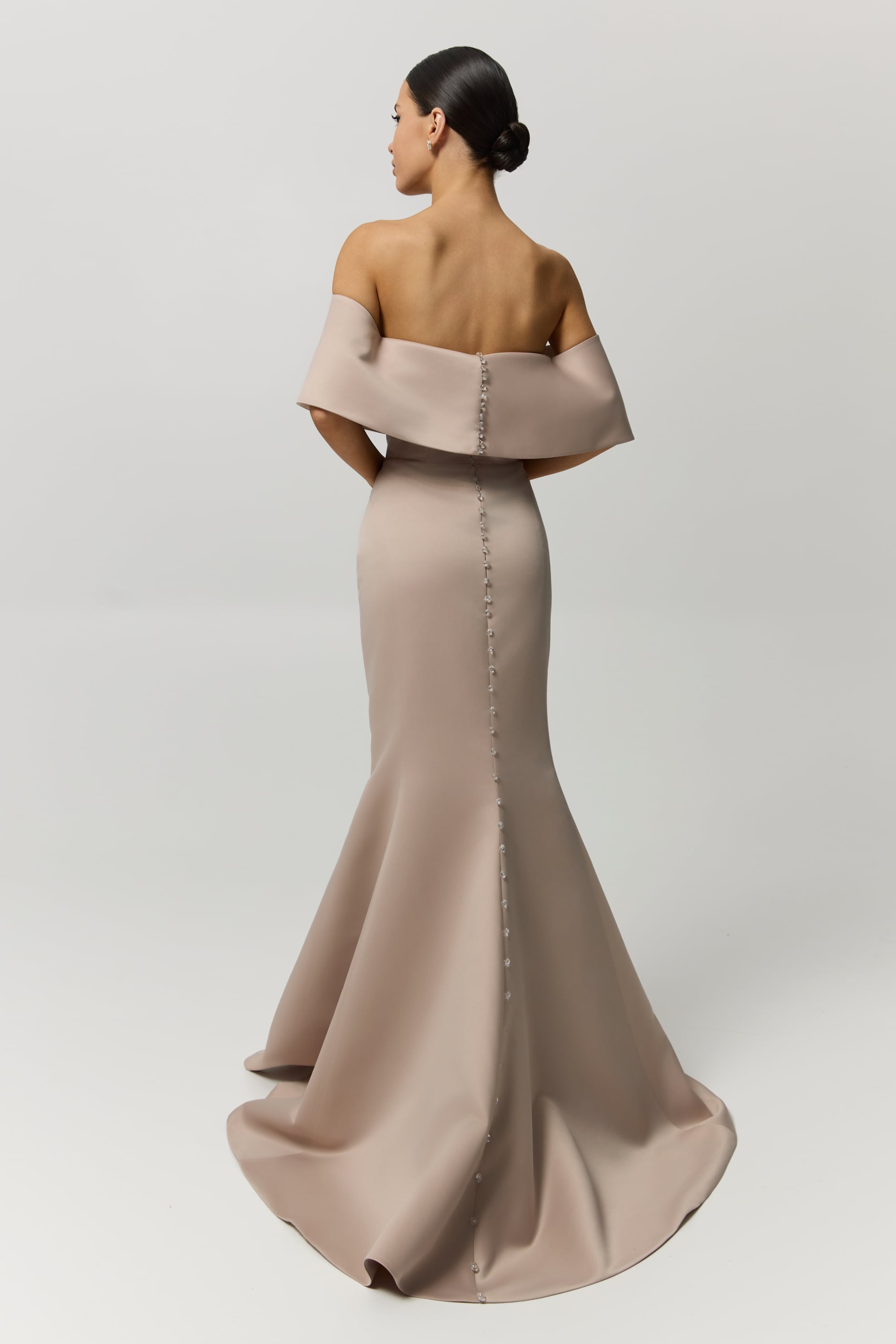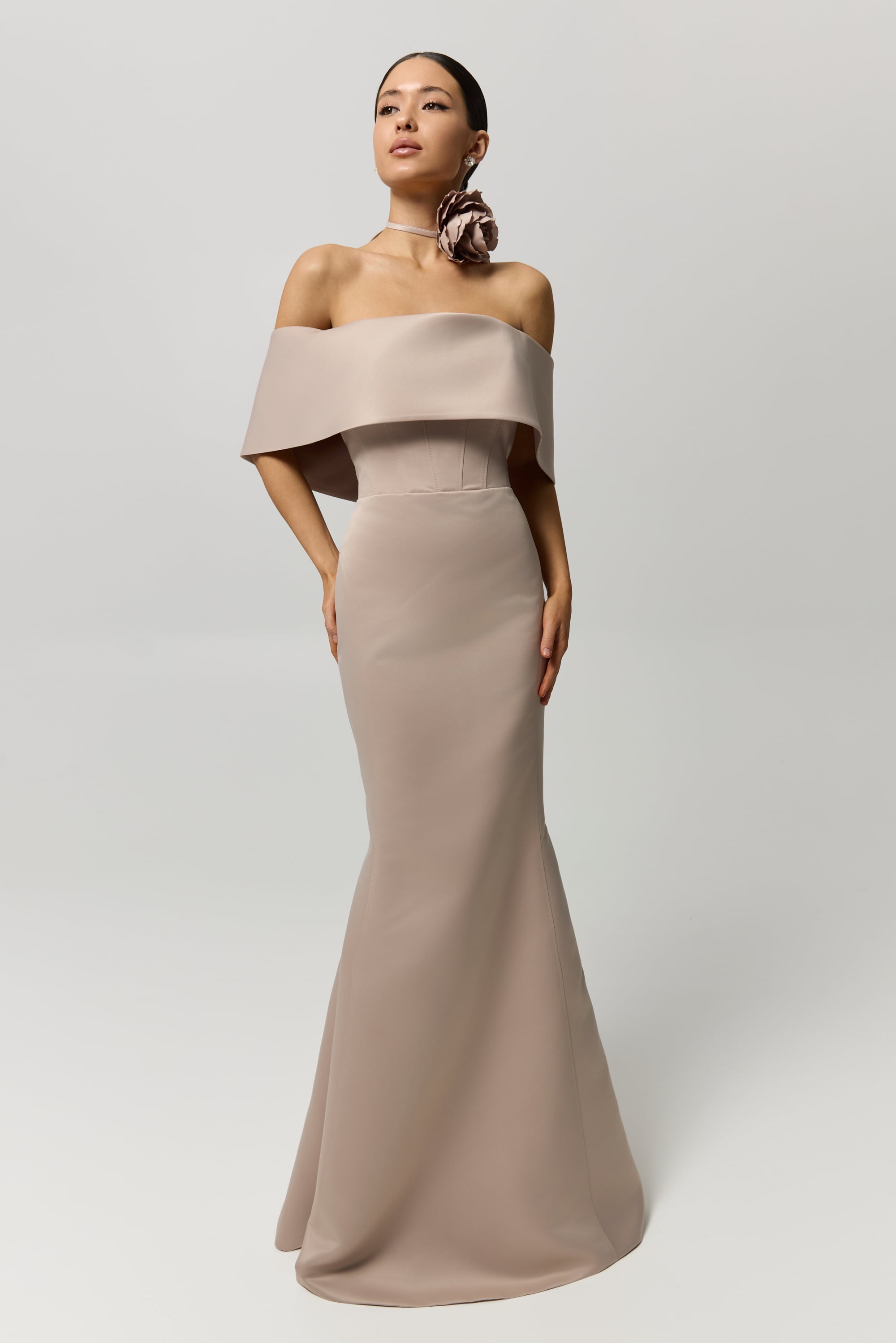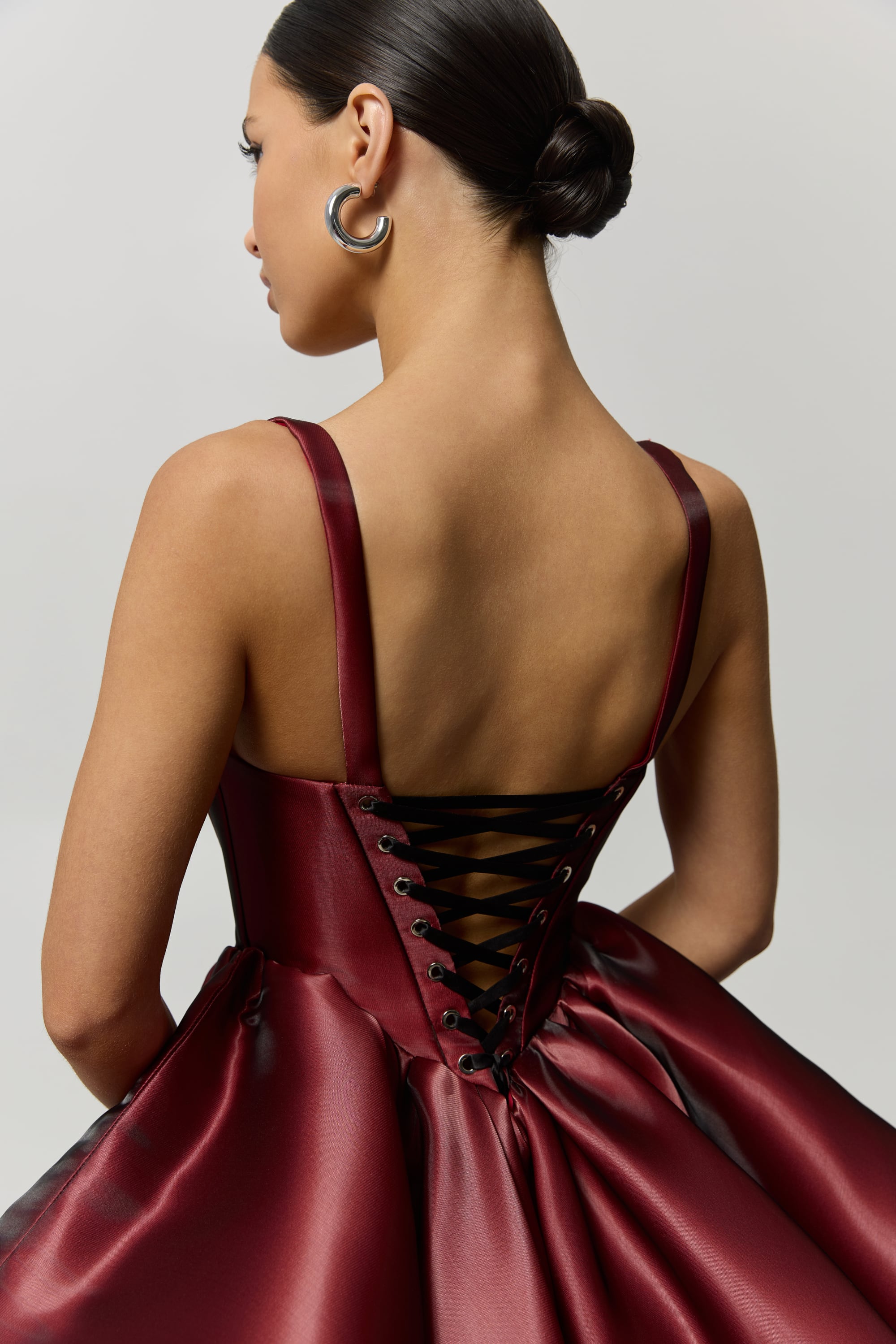 Sukienka wieczorowa E2528 to odważna, rzeźbiarska propozycja zaprojektowana tak, by zachwycać z każdej strony. Wykonana z lśniącej metalicznej satyny, ta mini sylwetka łączy strukturalny dekolt w kształcie serca z delikatnymi ramiączkami, które elegancko podkreślają ramiona. Dopasowany gorset akcentuje talię i biust, natomiast obszerna spódnica mini wprowadza wyrazisty kontrast i dynamiczny ruch przy każdym kroku. Sznurowane plecy dodają wizualnej intrygi oraz zapewniają regulowane, komfortowe dopasowanie. Głęboki bordowy odcień potęguje zmysłowy charakter projektu, czyniąc E2528 idealnym wyborem na koktajlowe przyjęcia, wieczorne imprezy i wyjątkowe celebracje, gdzie pewność siebie i nowoczesna elegancja grają główną rolę.