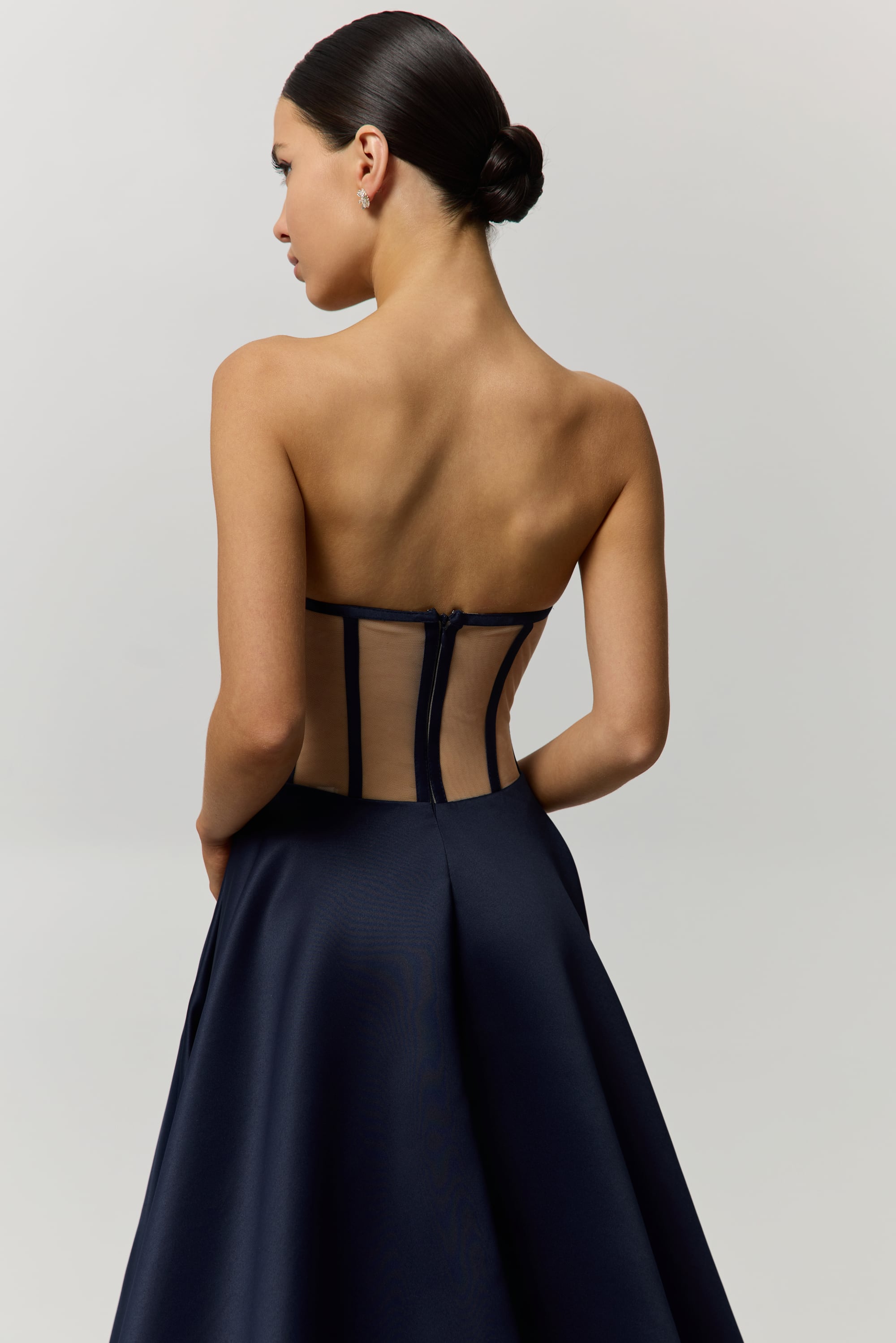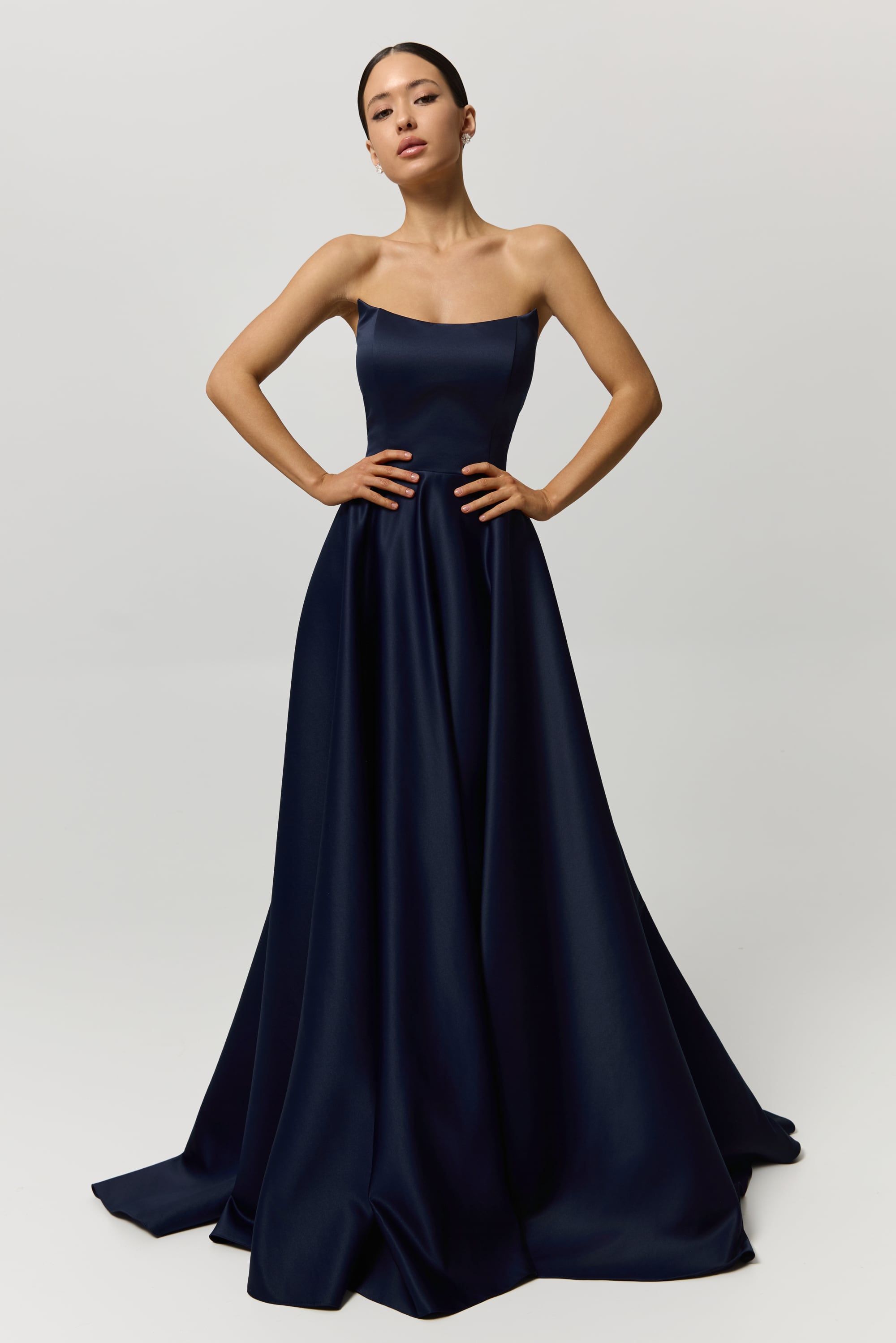 Model E2529 to efektowna wieczorowa sukienka mini zaprojektowana z myślą o niezapomnianym wejściu. Wykonana z lśniącej metalicznej satyny, przy każdym ruchu pięknie odbija światło, tworząc miękką, a zarazem dramatyczną poświatę. Prosty, poziomy dekolt subtelnie eksponuje ramiona i obojczyki, natomiast usztywniony gorset rzeźbi sylwetkę czystymi, pewnymi liniami. Sznurowane plecy wprowadzają wyrazisty detal i możliwość regulacji, podkreślając talię i dodając całości delikatnego, couture’owego charakteru. Obszerna, teksturowana spódnica wnosi element zabawy i kontrastu, zmieniając długość mini w odważny modowy manifest. Idealna na koktajlowe przyjęcia, modowe eventy i wieczory, w których pewność siebie jest najlepszym dodatkiem.