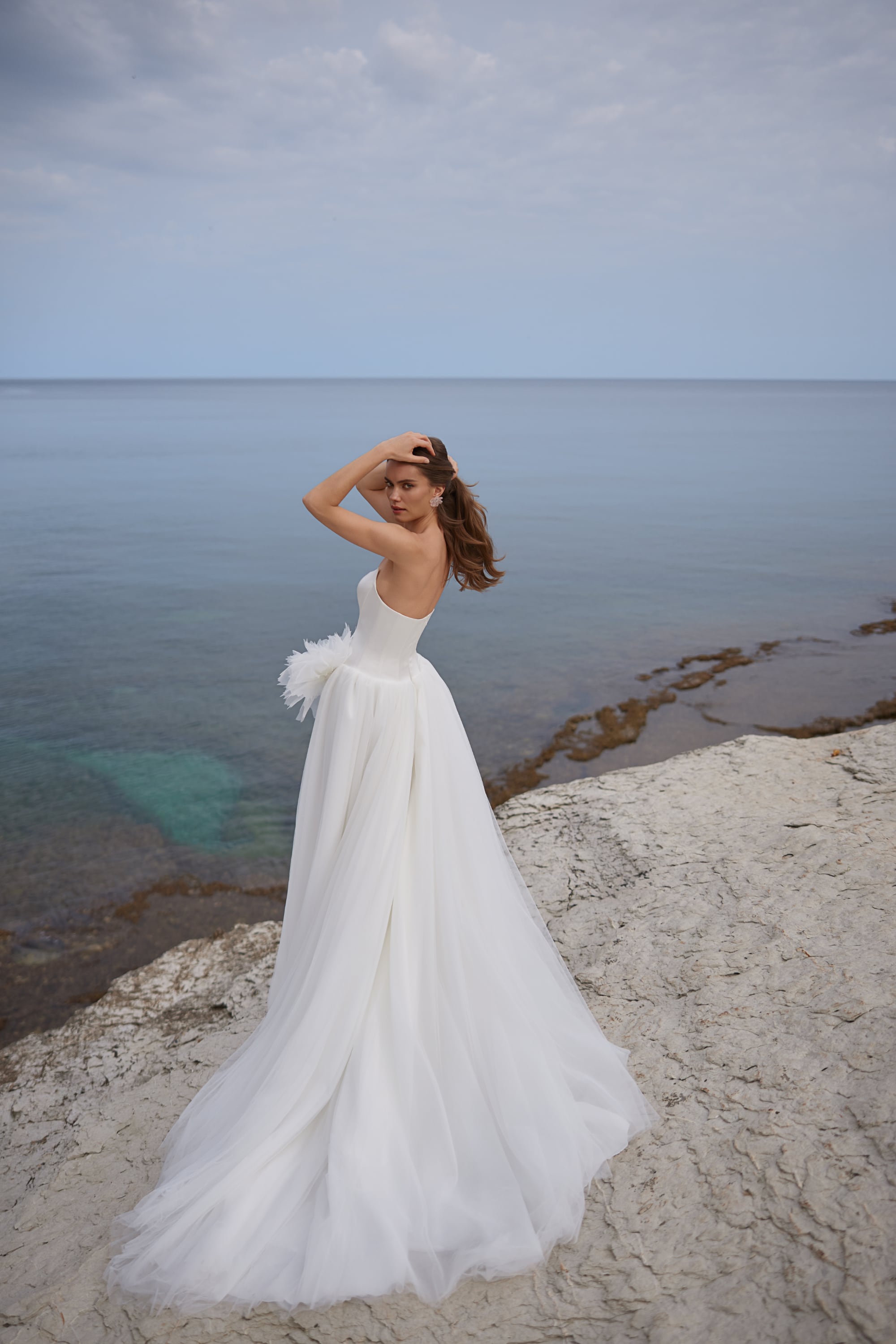 Suknia ślubna L601 to ciche piękno — takie, które nie musi podnosić głosu, by zostać zapamiętane. Wykonana z lekkiego tiulu nałożonego na gładką, połyskującą satynę, porusza się jak podmuch wiatru, łapiąc światło w miękkich, płynnych falach. Sylwetka A-Line emanuje naturalną kobiecością, a dekolt typu scoop dodaje nowoczesnej łagodności dopasowanemu gorsetowi. Bezrękawowy krój zachowuje czystość i minimalizm, pozwalając wybrzmieć naturalnej gracji panny młodej. Delikatny kwiatowy akcent przy biodrze oraz wysokie rozcięcie wprowadzają subtelną dramaturgię, a zamek z tyłu i spódnica do podłogi nadają całości ponadczasowy, czysty charakter.
