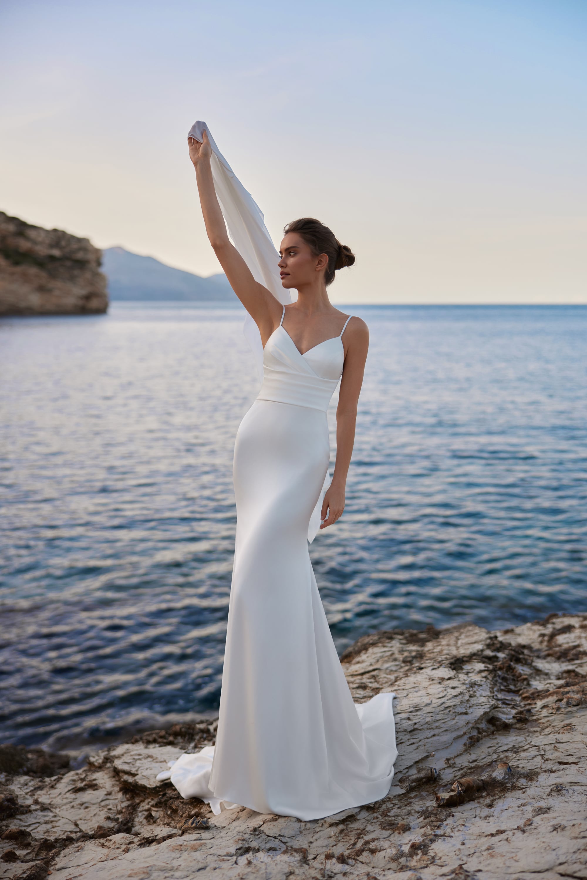 Suknia ślubna L608 jest smukła, lekka i pięknie zwiewna — stworzona z myślą o nadmorskim klimacie. Wykonana z płynnie układającej się satyny flex, delikatnie sunie po sylwetce, nadając jej miękki, subtelny połysk. Krój Fit & Flare łagodnie podkreśla figurę, by następnie przejść w długą, swobodnie opadającą spódnicę.
