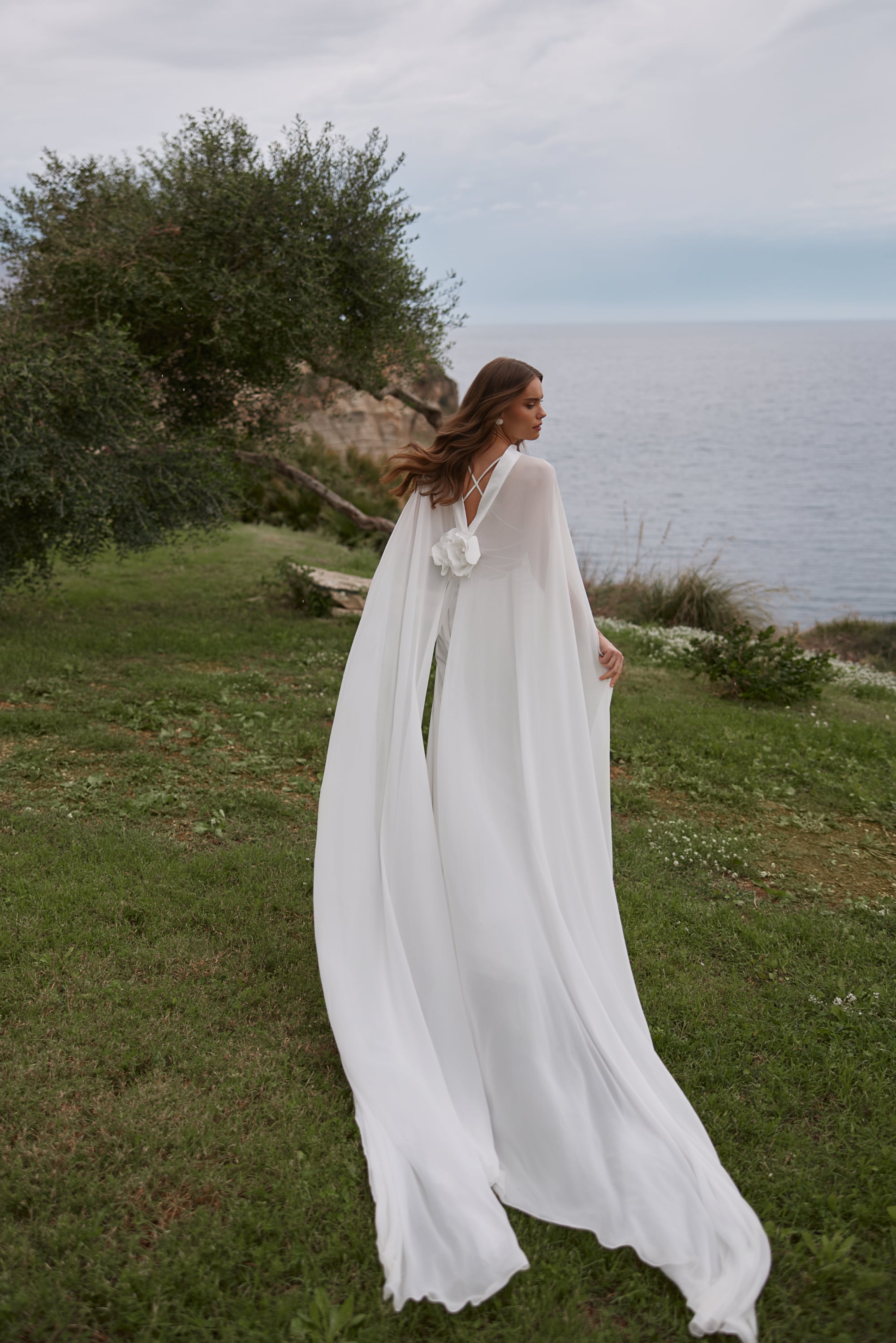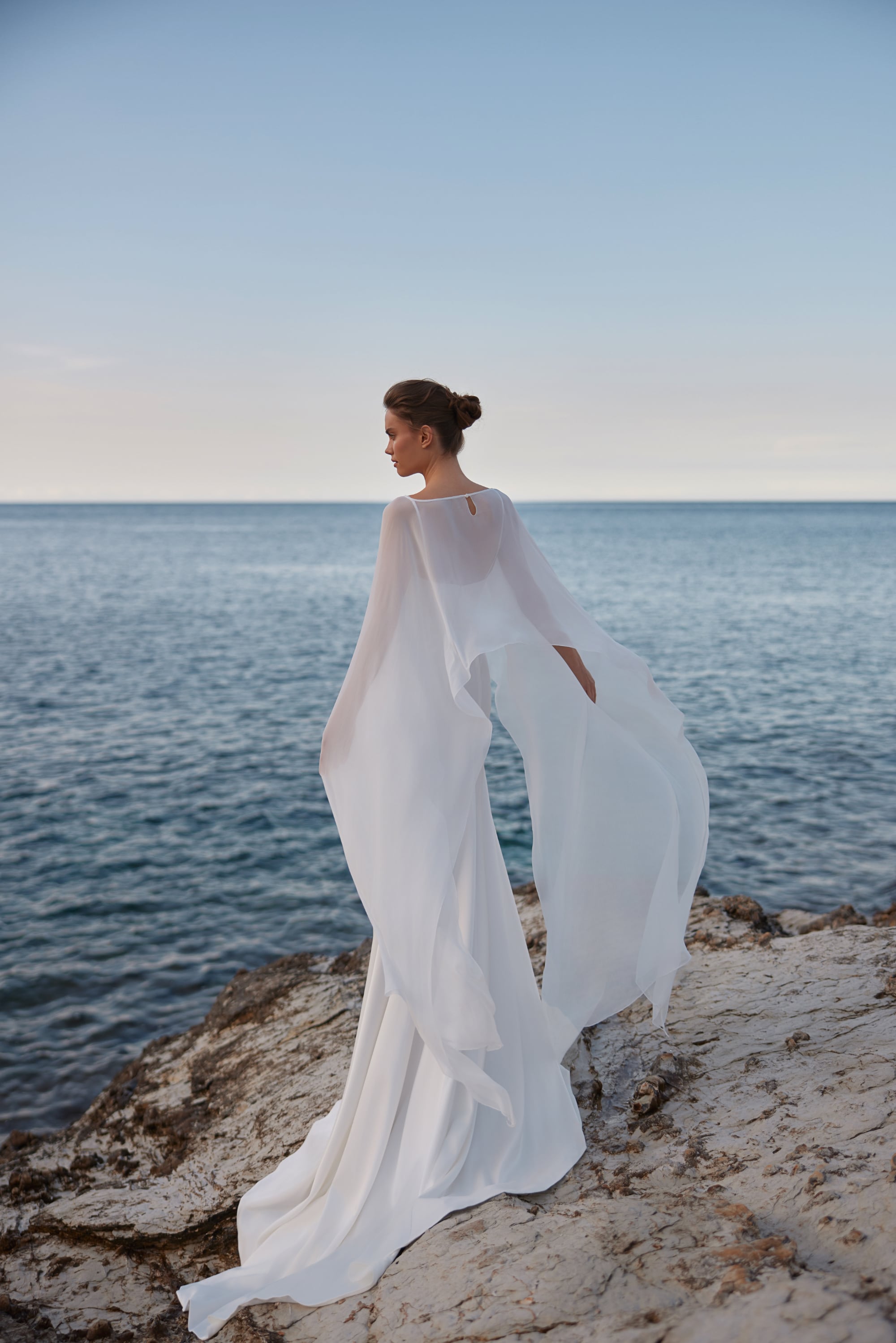 Czysty dekolt w kształcie litery V oraz delikatne ramiączka tworzą świeży, nowoczesny look, idealnie równoważący prostotę i elegancję. Gładki zamek z tyłu zachowuje minimalistyczny, dopracowany charakter. Opcjonalne szyfonowe skrzydła dodają poetyckiego ruchu uchwyconego przez wiatr, nadając sukni niemal eteryczną lekkość. To kreacja pełna swobody i gracji — idealna dla panny młodej ceniącej dyskretne piękno z nutą magii.