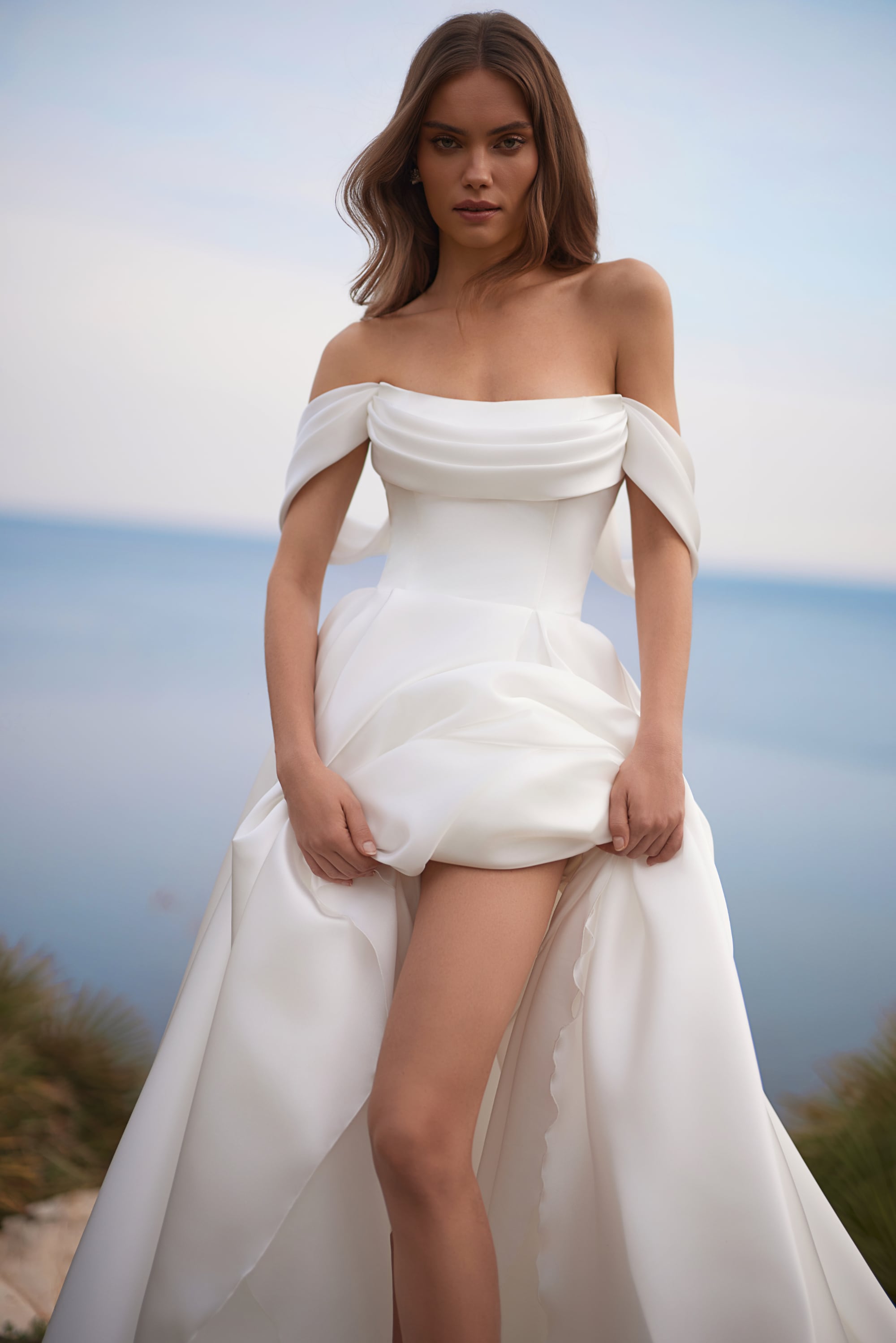 Suknia ślubna L629 to romantyczny model o kroju A-Line, wykonany z luksusowej satyny metalicznej, która łączy nowoczesny charakter z ponadczasową elegancją. Dekolt typu off-shoulder miękko układa się na ramionach, tworząc subtelną, kobiecą linię, a dopasowany gorset nadaje całości czystą i elegancką formę. Lekka spódnica opada swobodnie do podłogi, poruszając się naturalnie i pięknie odbijając światło. Krótkie rękawy typu off-shoulder oraz dyskretny zamek z tyłu zapewniają komfort i wyrafinowany wygląd. L629 to idealna propozycja dla panny młodej, która pragnie klasycznej sukni ślubnej z nutą miękkości — delikatnej, eterycznej i subtelnie wyrazistej.