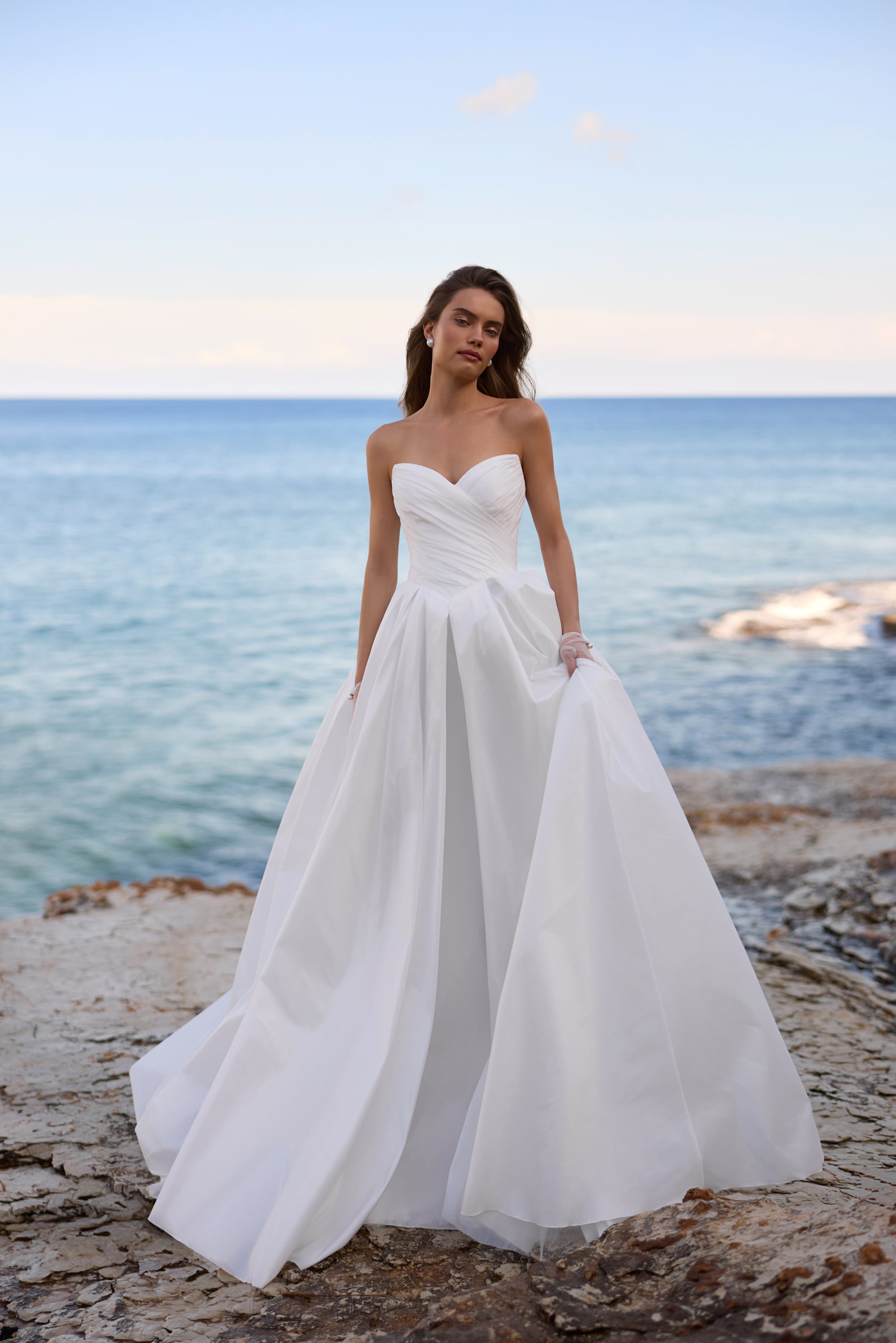 The L518 minimalist wedding dress is a true showstopper, combining elegance with a touch of drama. Made from delicate organza, it hugs the body in a classic mermaid silhouette, flaring out at the knees into a flowing, airy skirt. The straight-across neckline adds a modern, structured look, while the pleated detailing on the bodice creates a soft yet striking effect. Completely strapless, this bridal gown highlights the shoulders and collarbone beautifully. The zipper back ensures a sleek and seamless fit, enhancing the natural curves. Perfect for brides who want a refined yet unique wedding dress, the L518 is both sophisticated and effortlessly stylish.